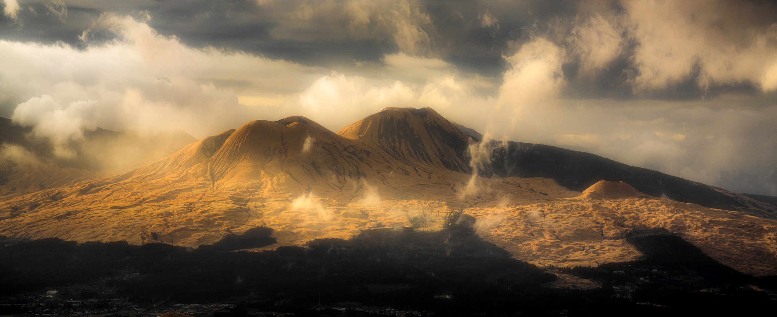 阿蘇山の杵島岳付近が朝日で照らされて幻想的でした♪ パノラマになってるので拡大してご覧ください