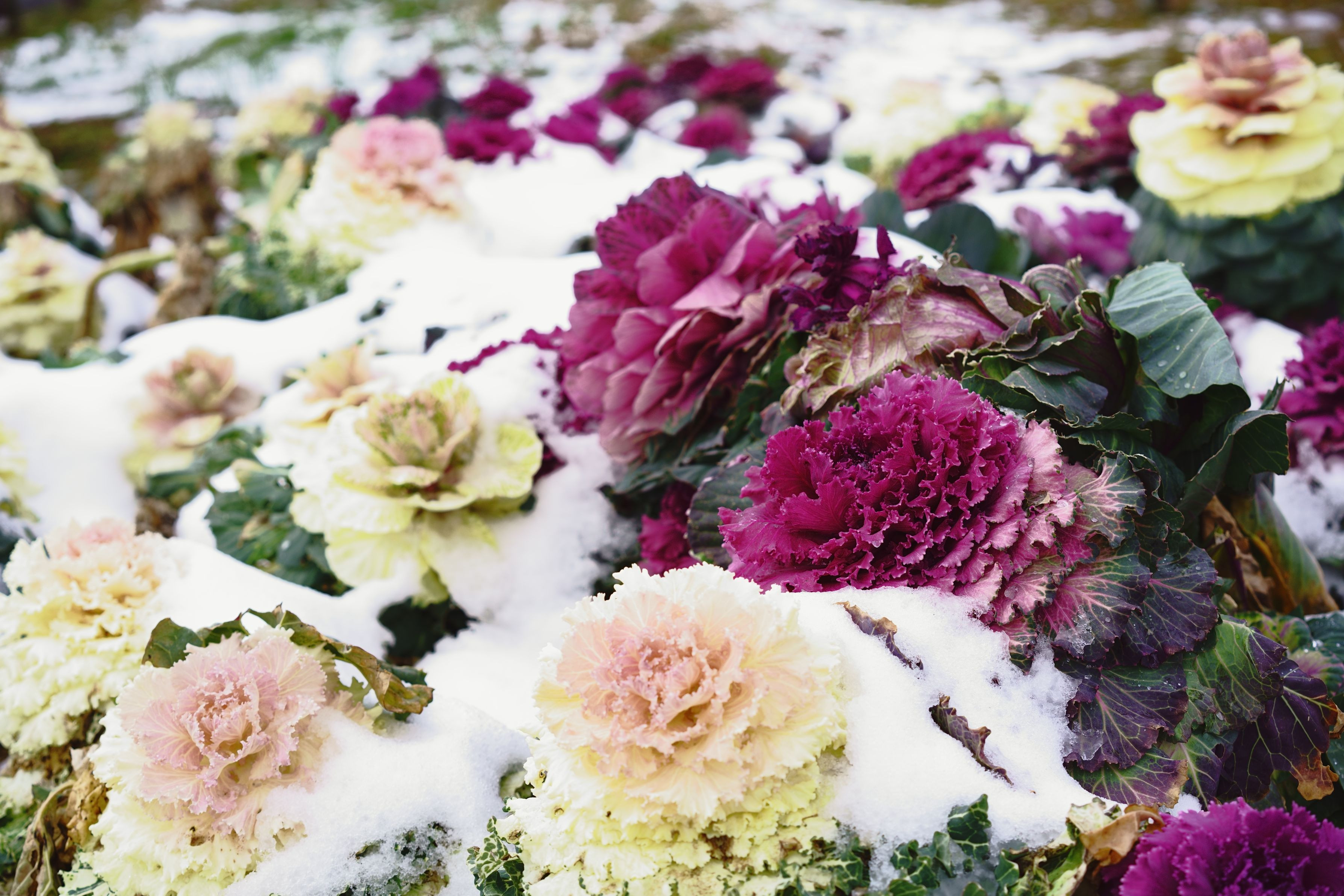 葉牡丹の間に雪が残る。