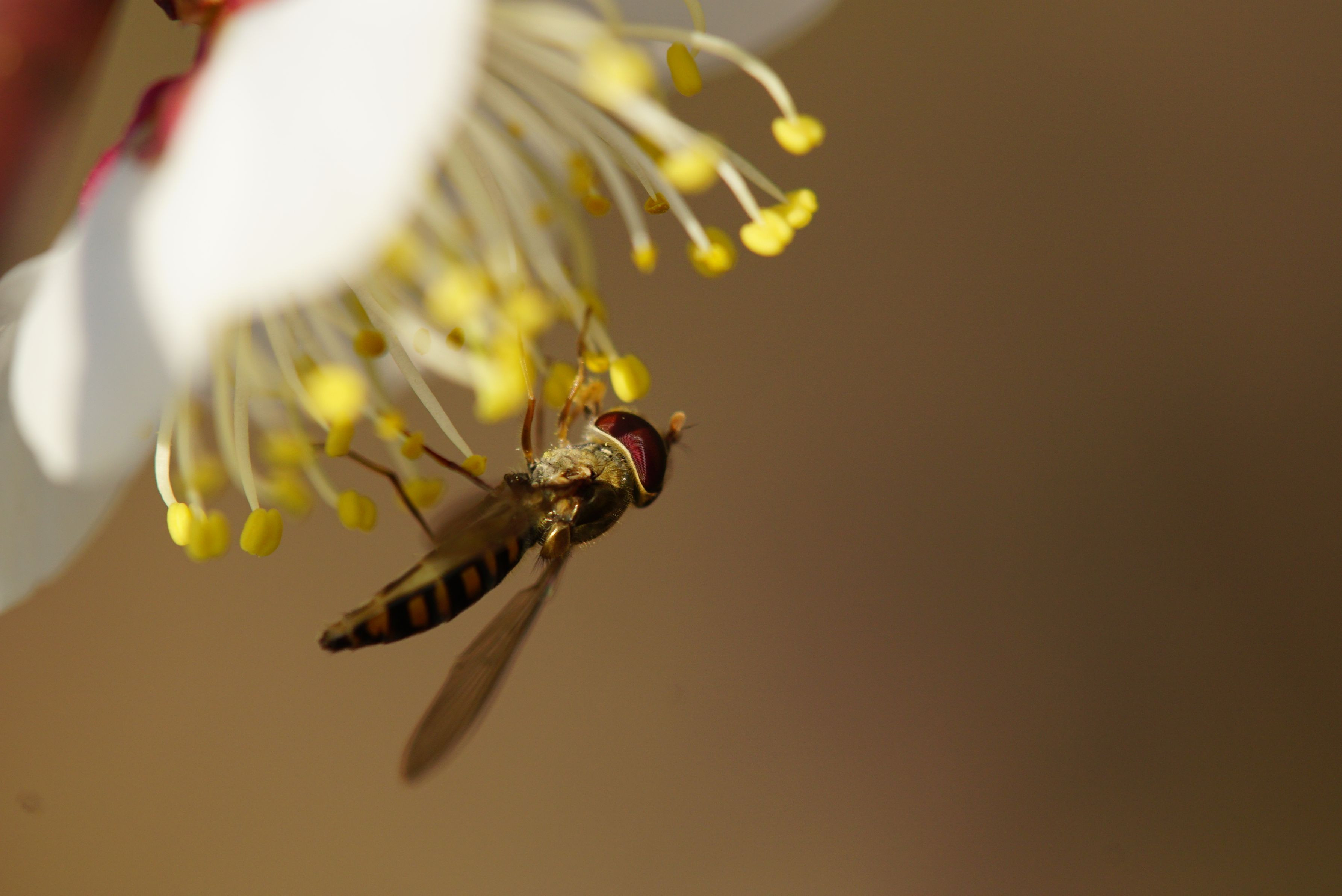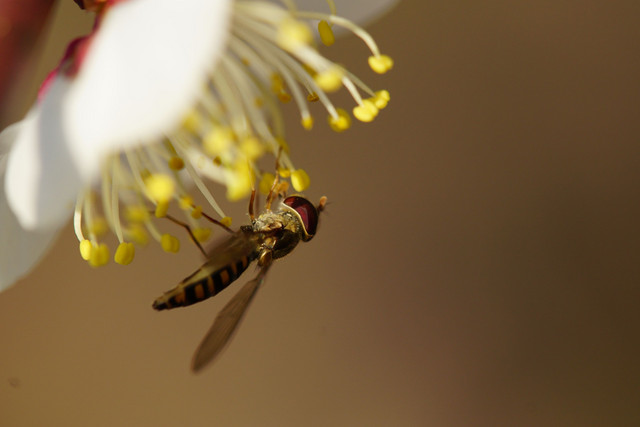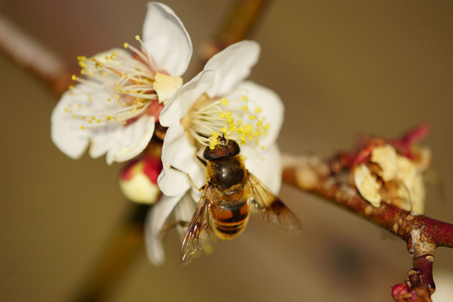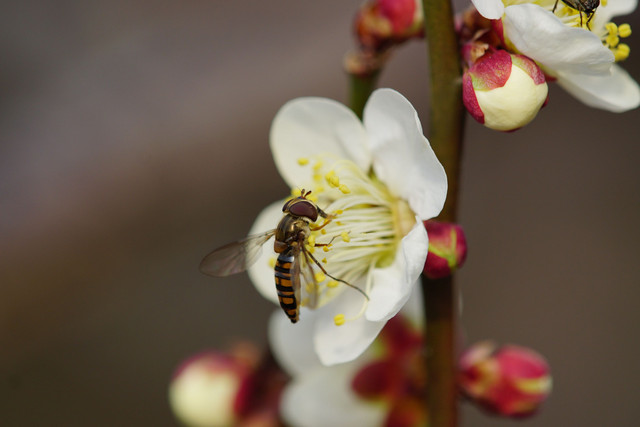 白梅の香りにいざなわれて、ナミハナアブとホソヒラタアブがやってきました。ホソヒラタアブは同個体です。