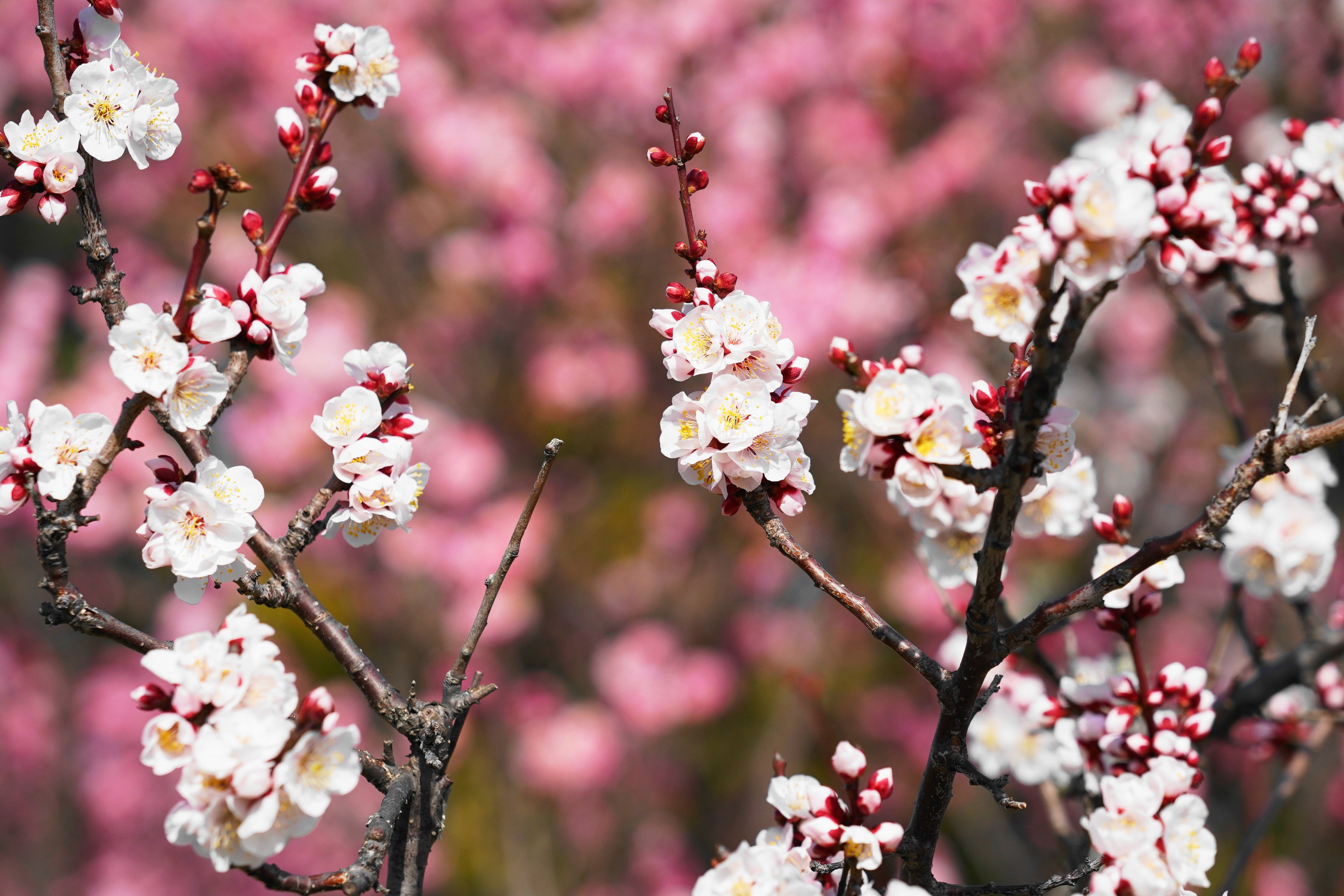 紅梅が先に咲き始め、ようやく白梅が追い付いてきました。メジロも忙しく、飛び回っていました。
