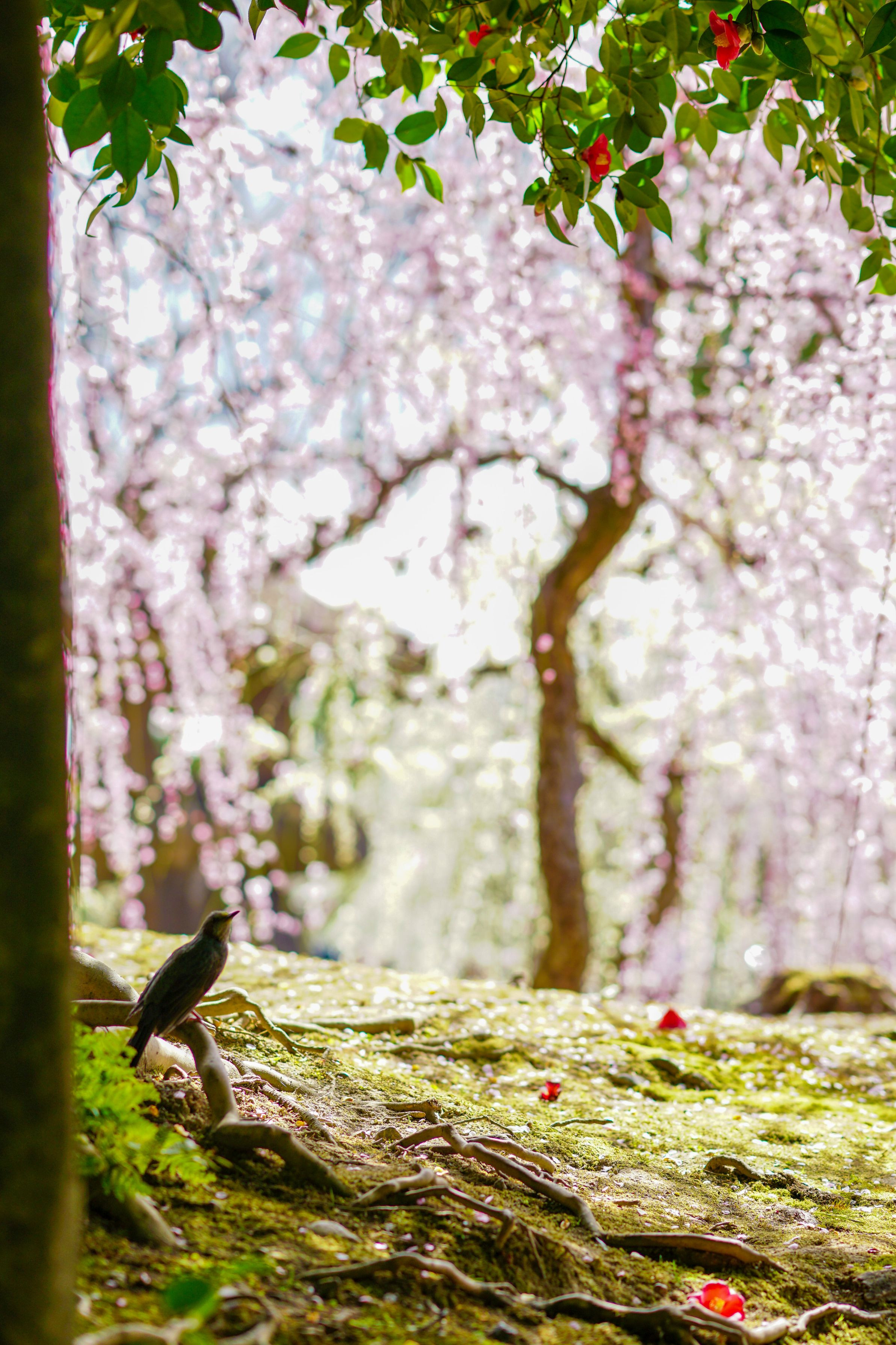 しだれ梅と椿の絶妙なコントラストのところにツグミがやってきてくれました。