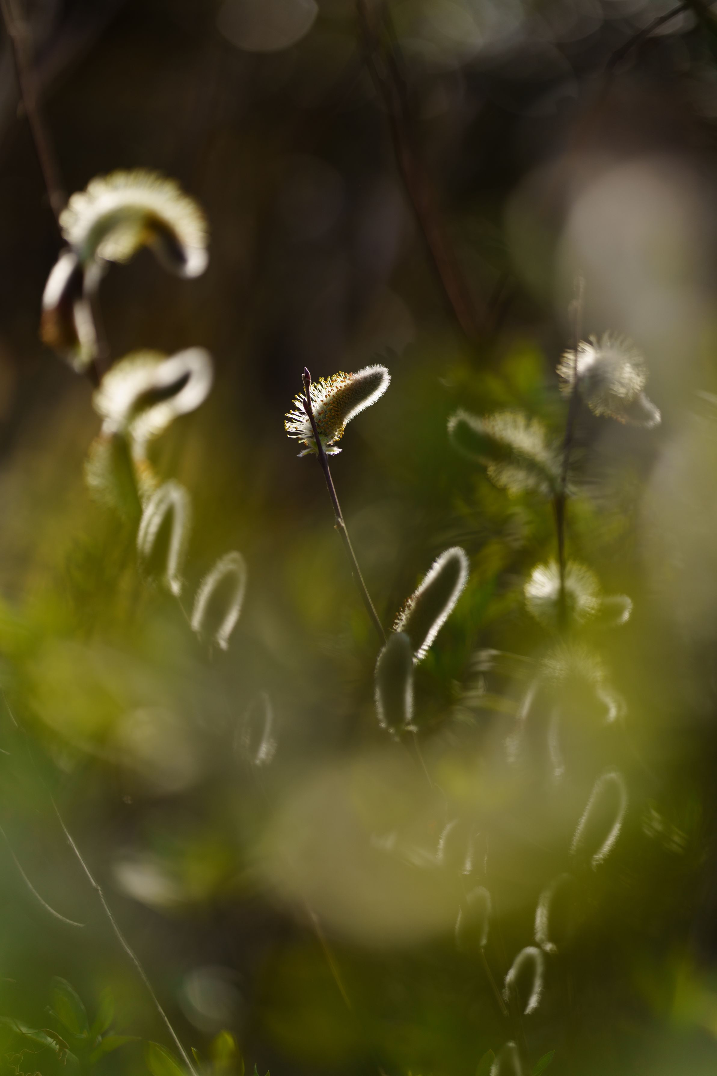逆光で撮った振袖柳。 ふさふさした部分が光を反射してとても綺麗でした。 よ~く見てみると、なんと、花が咲いていました! 振袖柳にも春が訪れていました。 ※名前は振袖柳のようなので、修正しました!