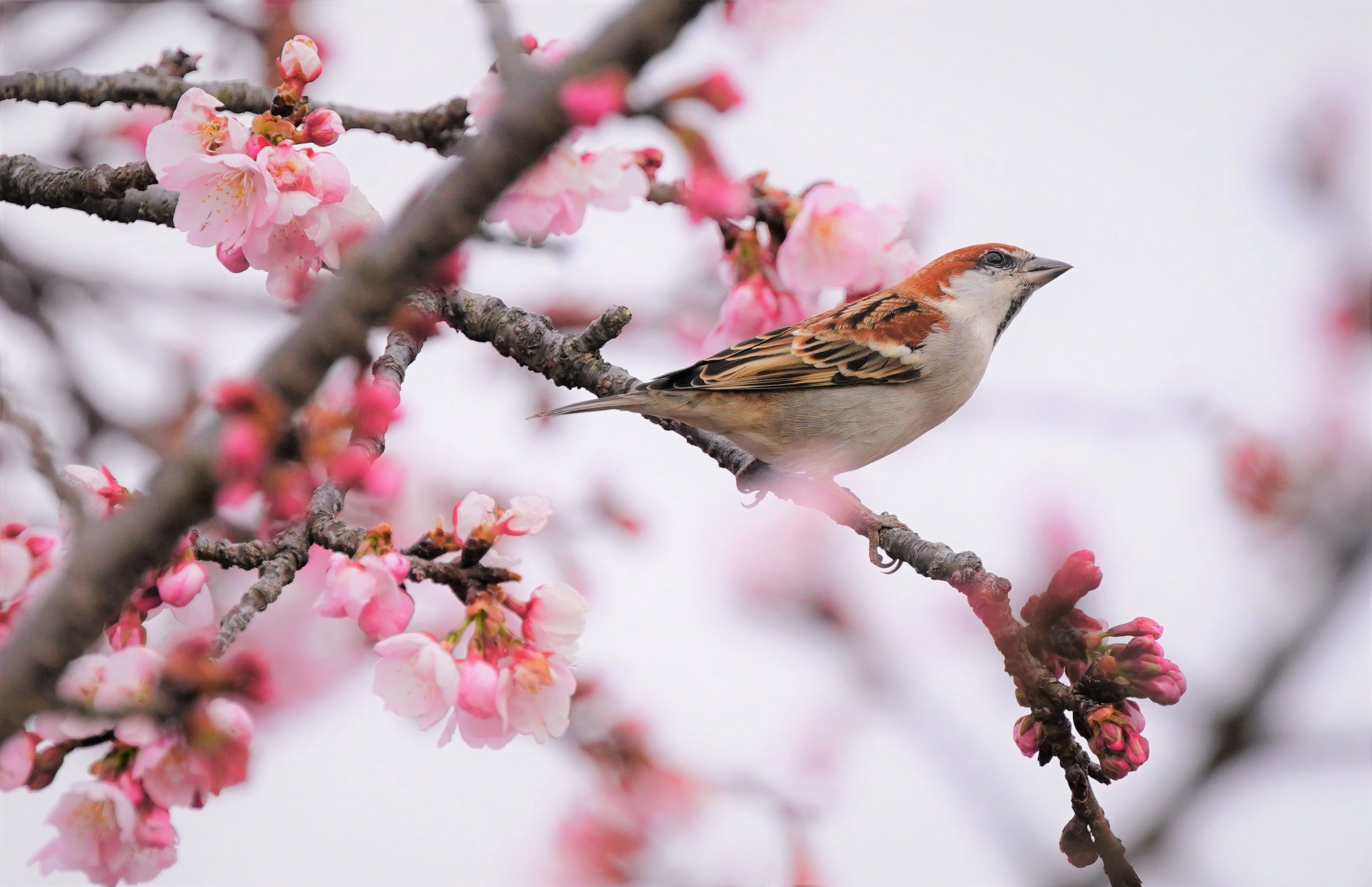 三月になると 毎年ここに通ってしまいます。 甘い桜の蜜には メジロ、ヒヨドリ、カワラヒワなども吸蜜に飛来しますが 一番私が楽しみにしているのは ニュウナイスズメ軍団です。 器用に花をクルクル回す仕草は 春の歳時記の1ページを飾ってくれます。