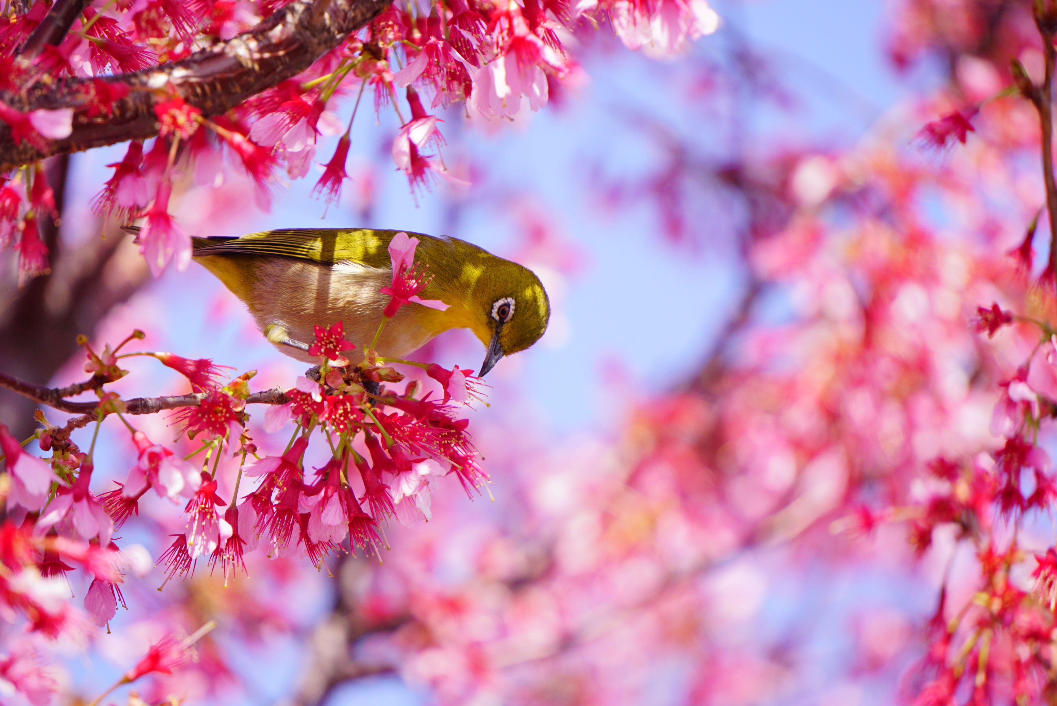 メジロとおかめ桜、鶴見川のほとりにて。
