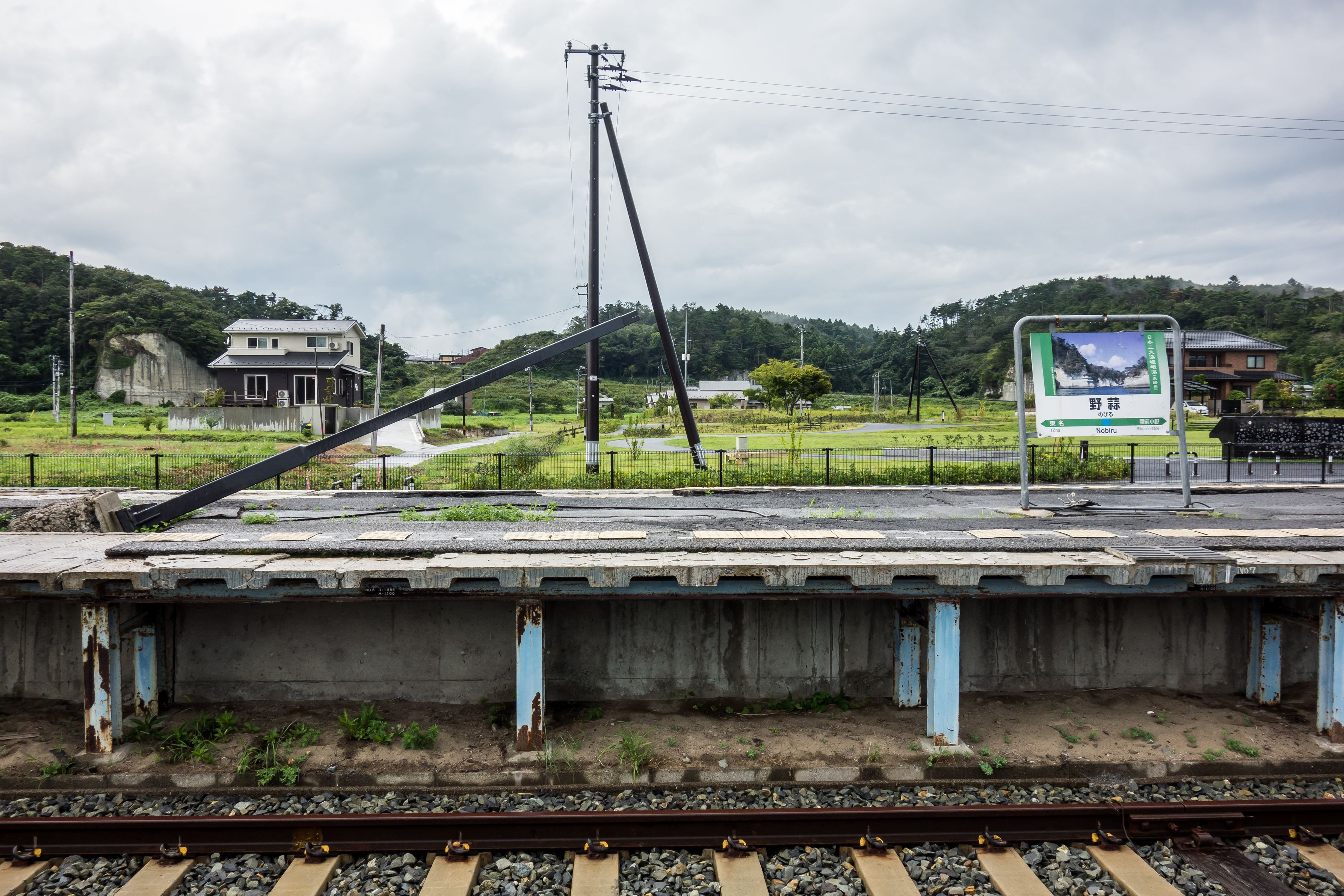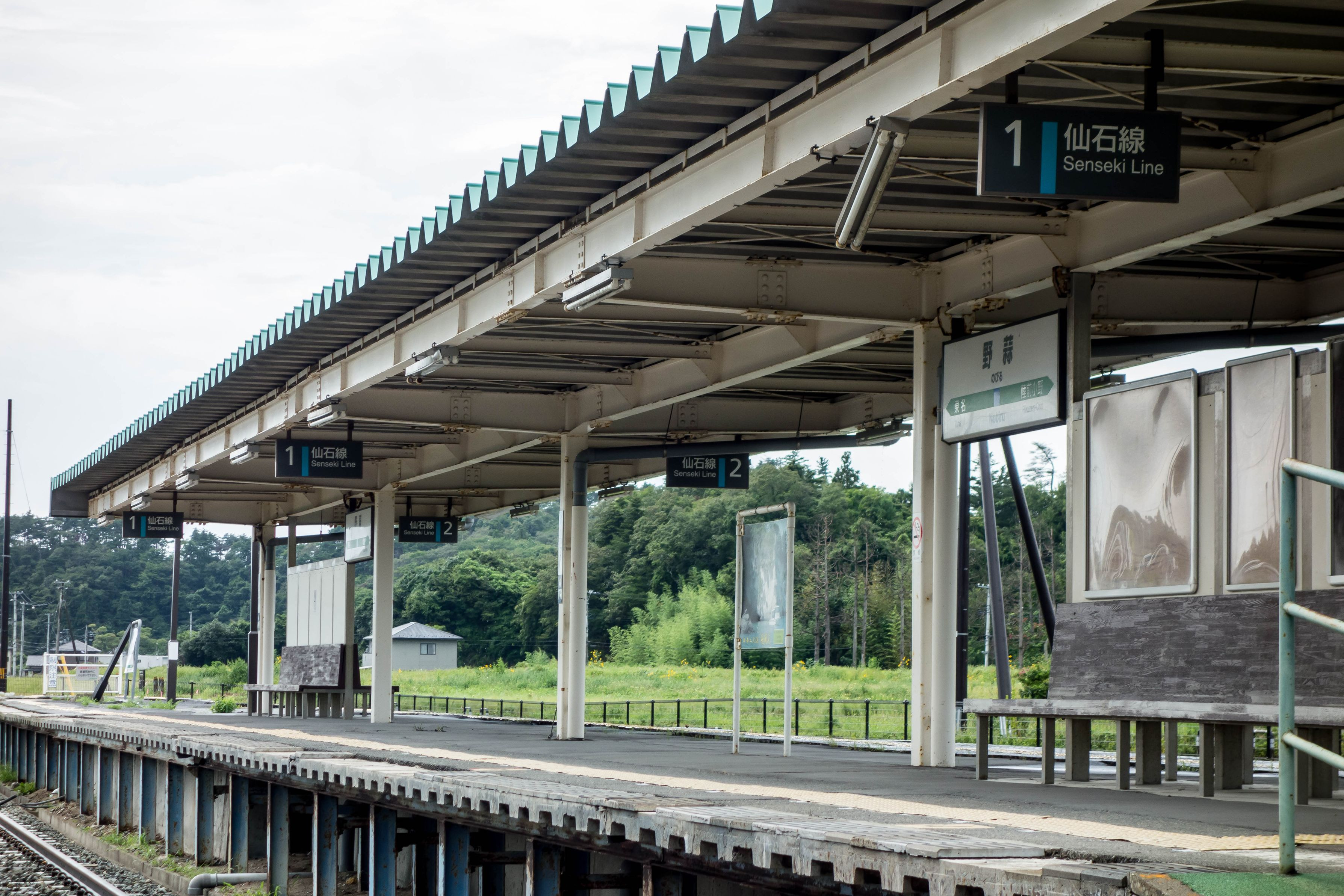 現野蒜駅のホームからは旧駅舎が見えます。