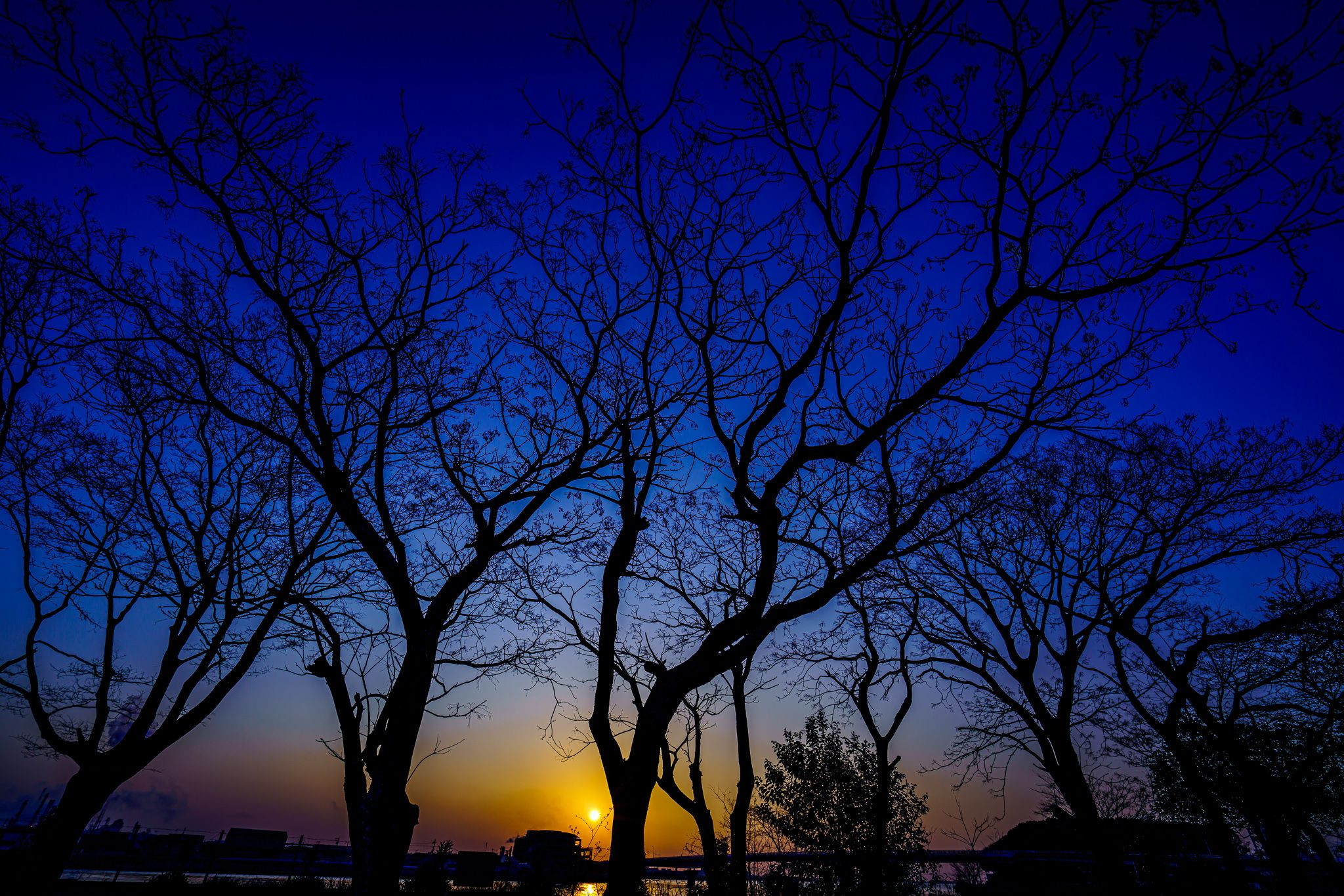 枯れ木の状態のセンダン越に見える日の出。間にあるのは揖保川。