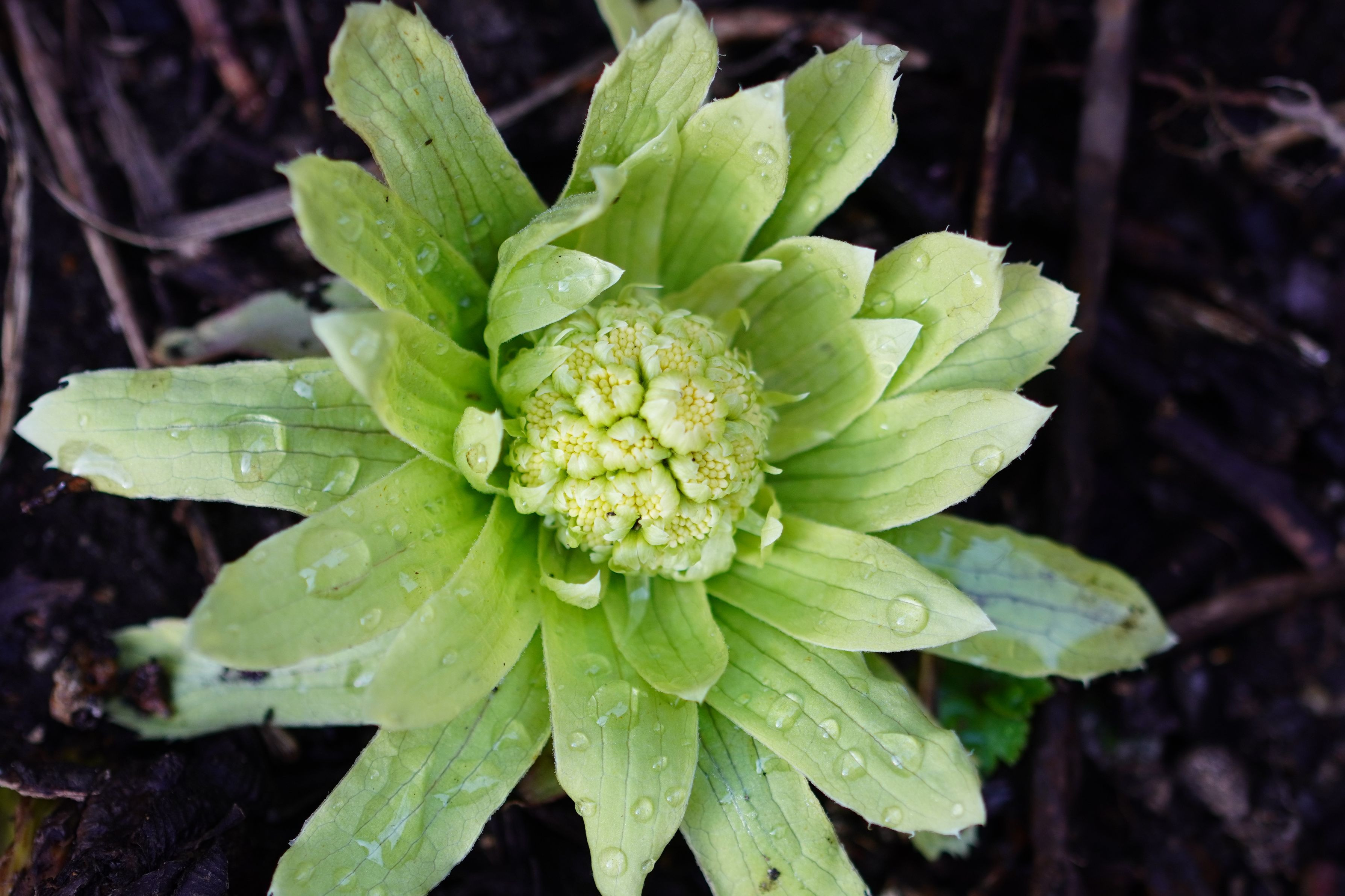今日の黄梅と雨に濡れたフキノトウ。