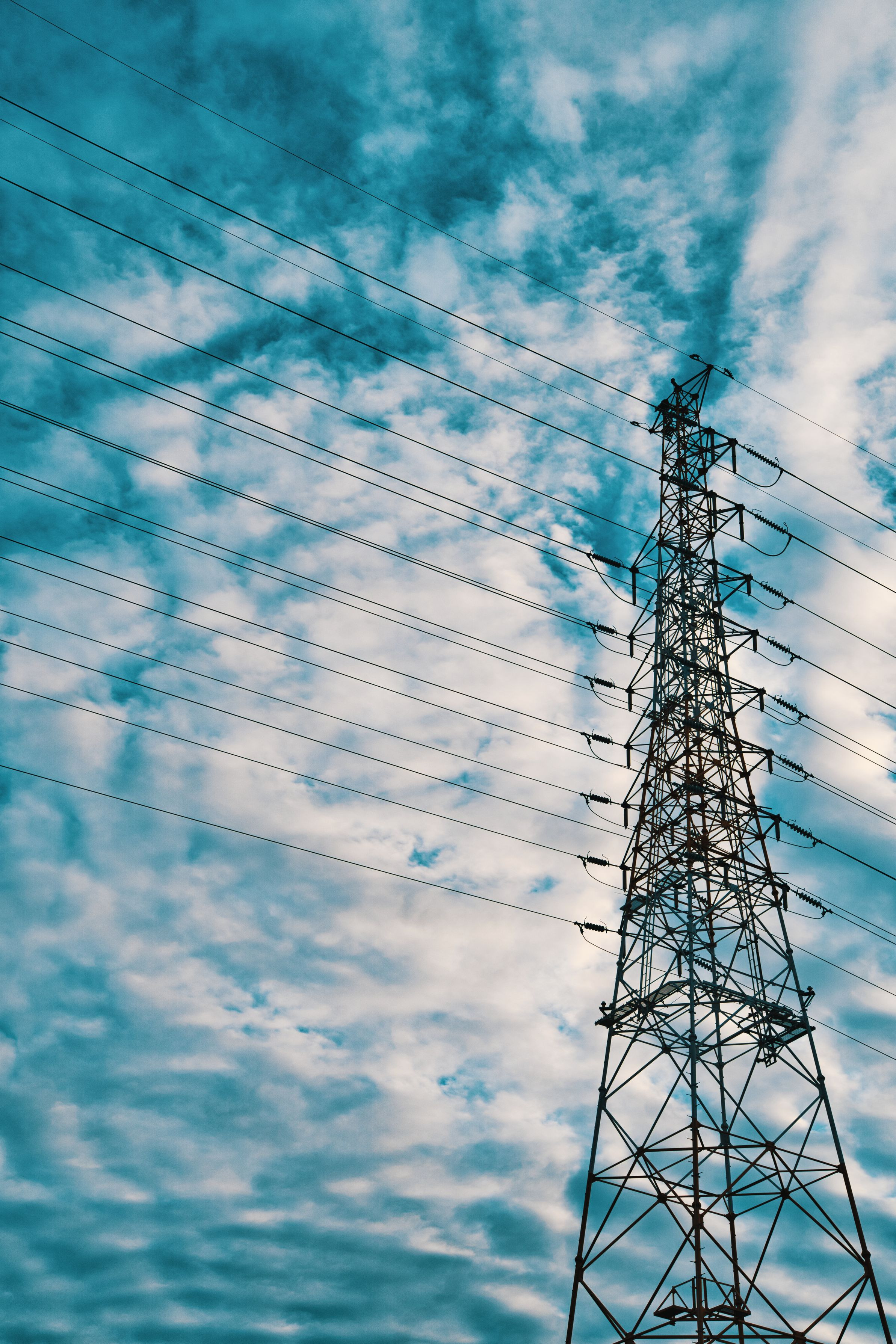 空 雲 鉄塔 電線 高圧線 平行線 ティール&オレンジ風