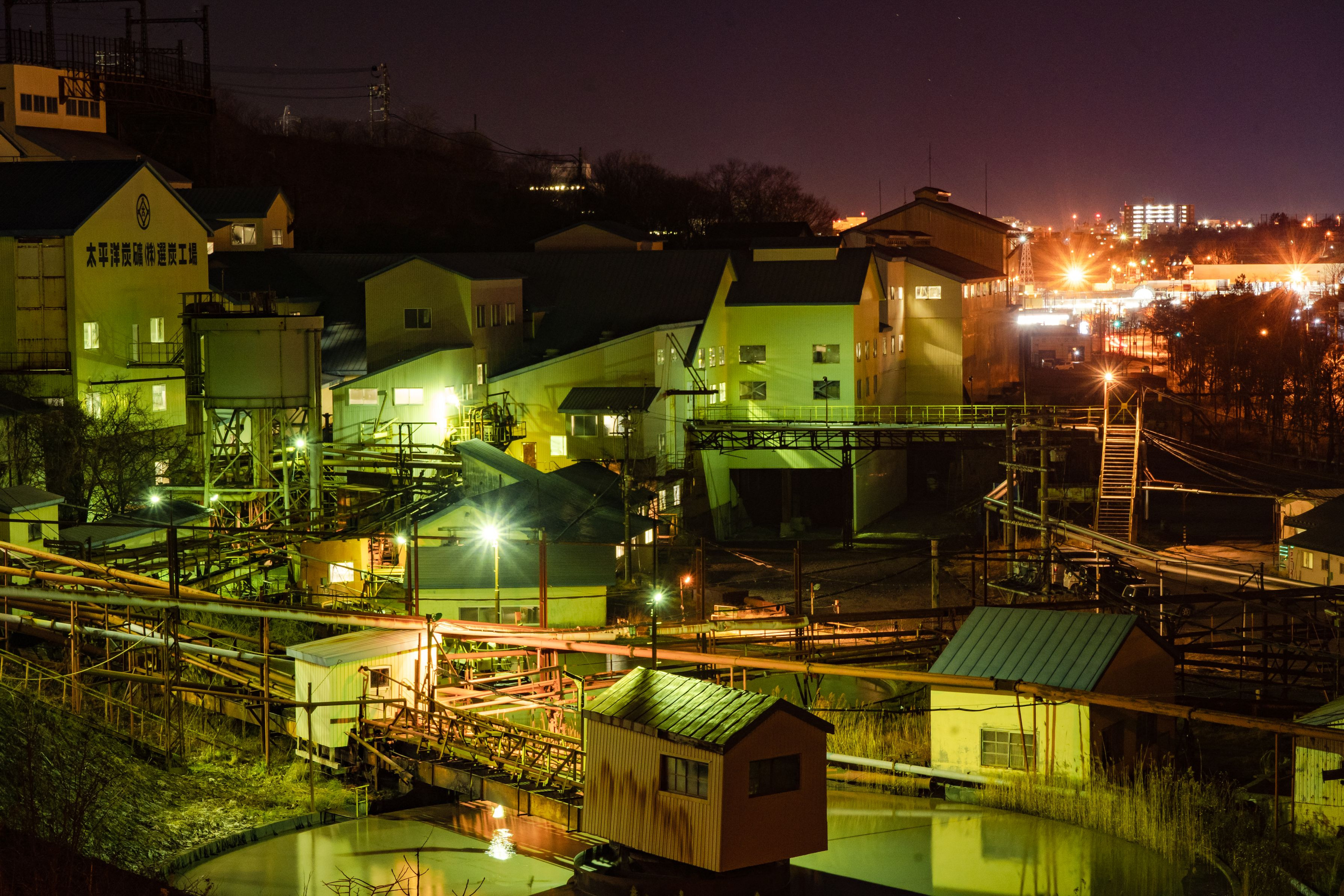 今や日本で唯一となった海底での坑内掘り炭鉱「釧路コールマイン」(旧太平洋炭鉱) 選炭工場に次々と石炭が運ばれてきます。今は採掘量も減少したため、夜間の作業光景は貴重となっています。