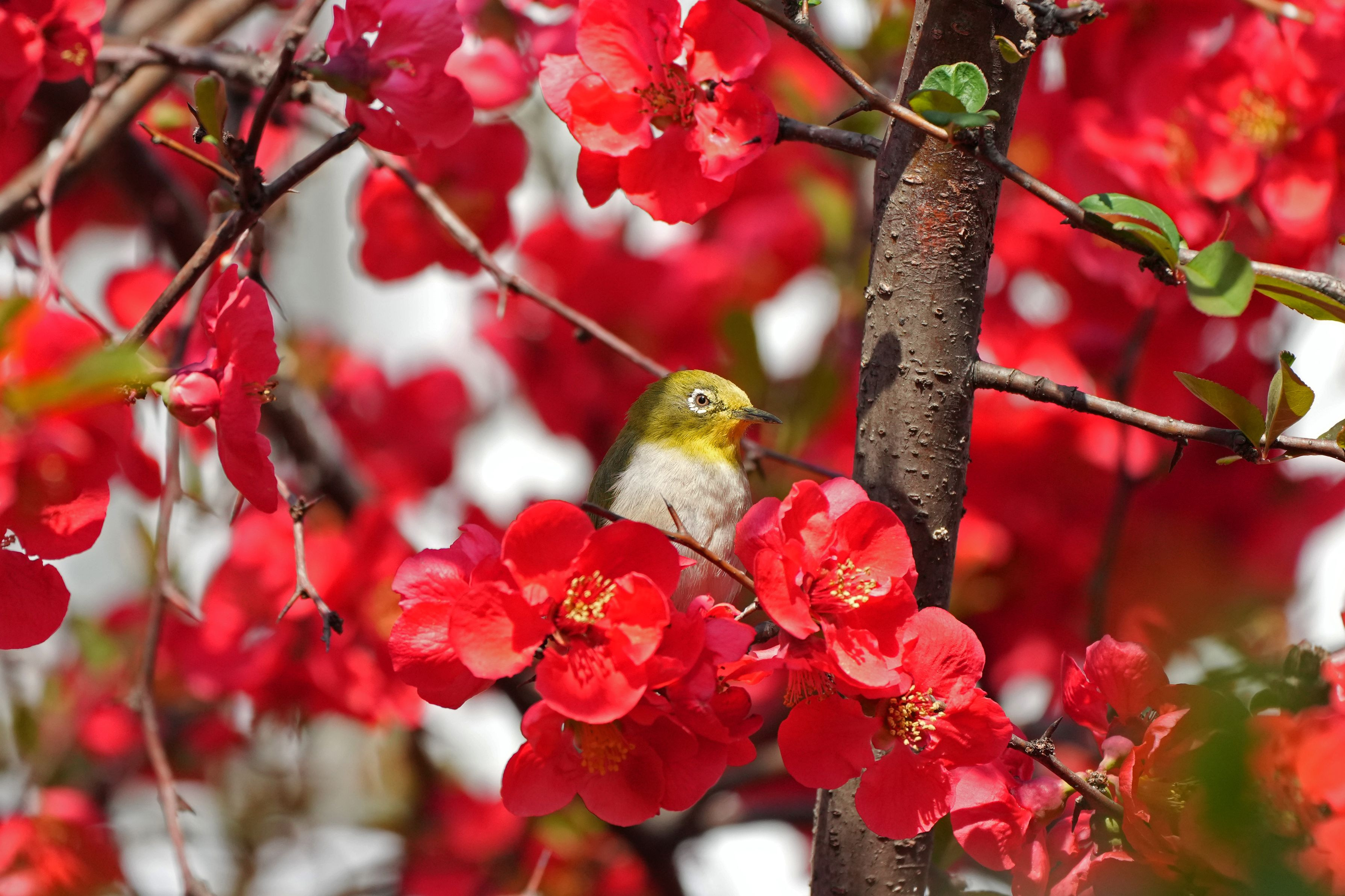 ボケの木に満開の赤い花。 その中に身を潜めています。