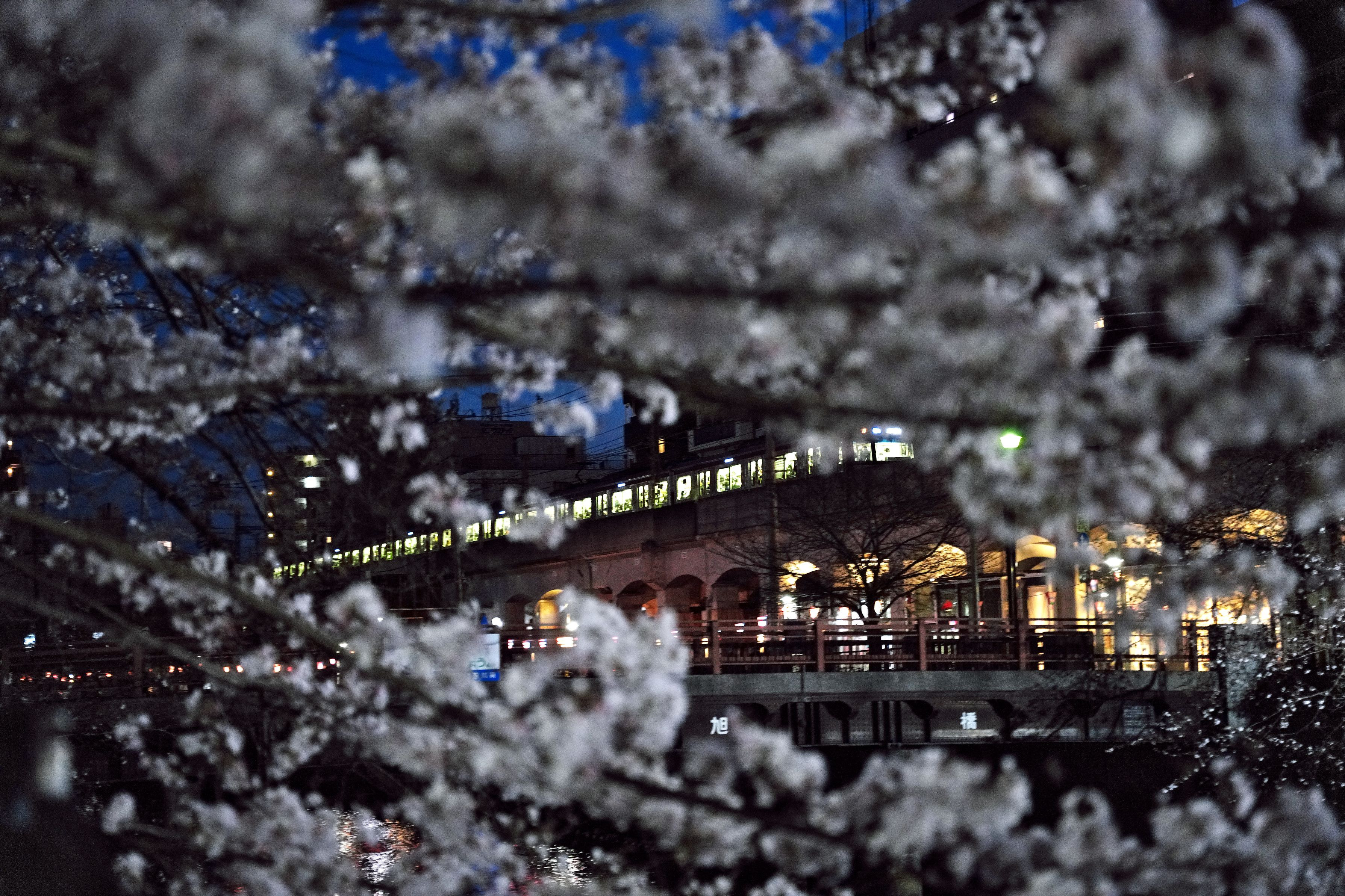 大岡川の桜、今年は店も出てなく人出が少ないです。 快走する京浜急行とお花見クルーズボートです。