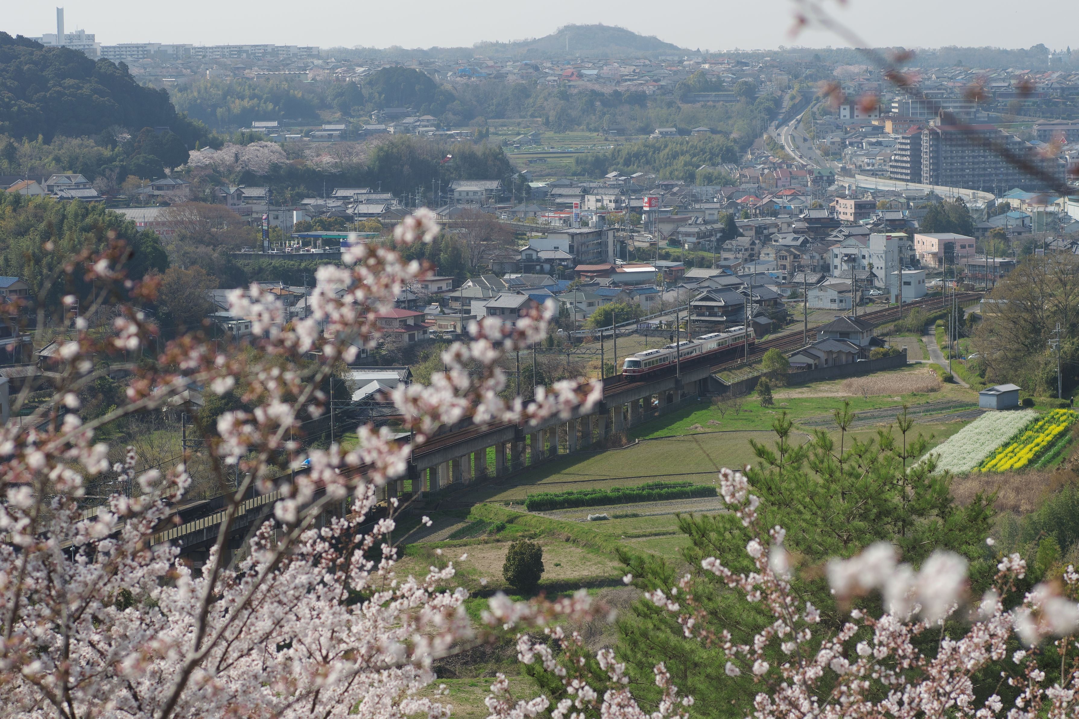 少し霞んだ日、河内長野市を走る南海高野線の電車を撮りました。離れていて、電車の音がコトコトと、おもちゃのようで可愛かったです。