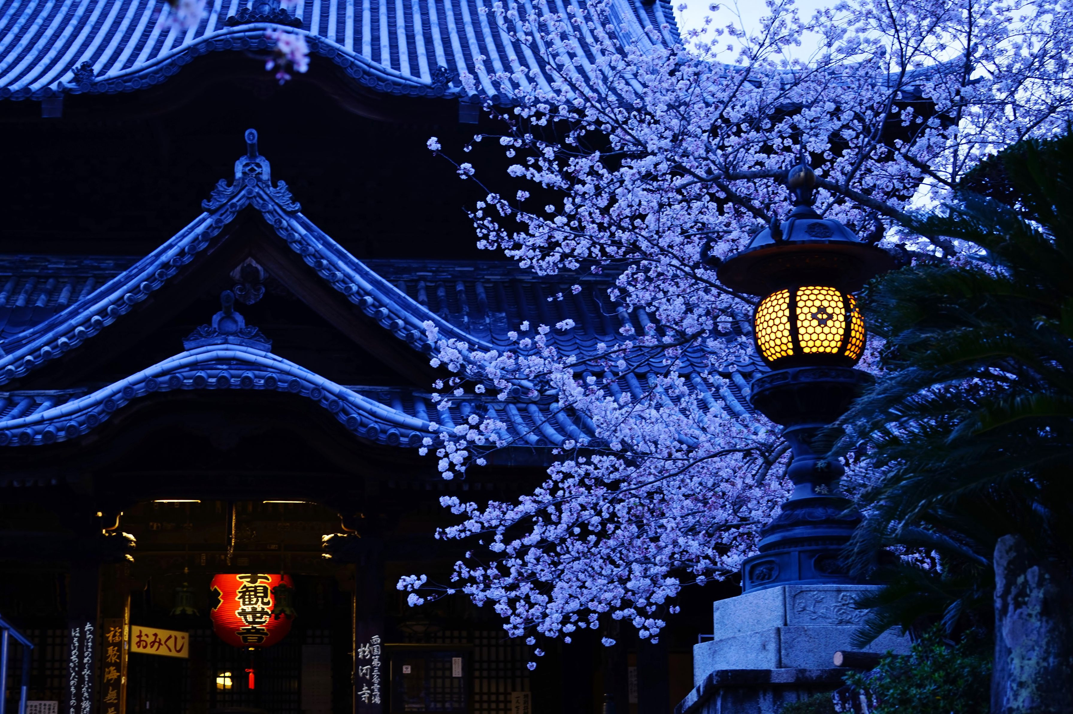 センサーが感知して灯篭に灯りが点りました。 広い境内に一人、夜桜お七の気分です❀❀