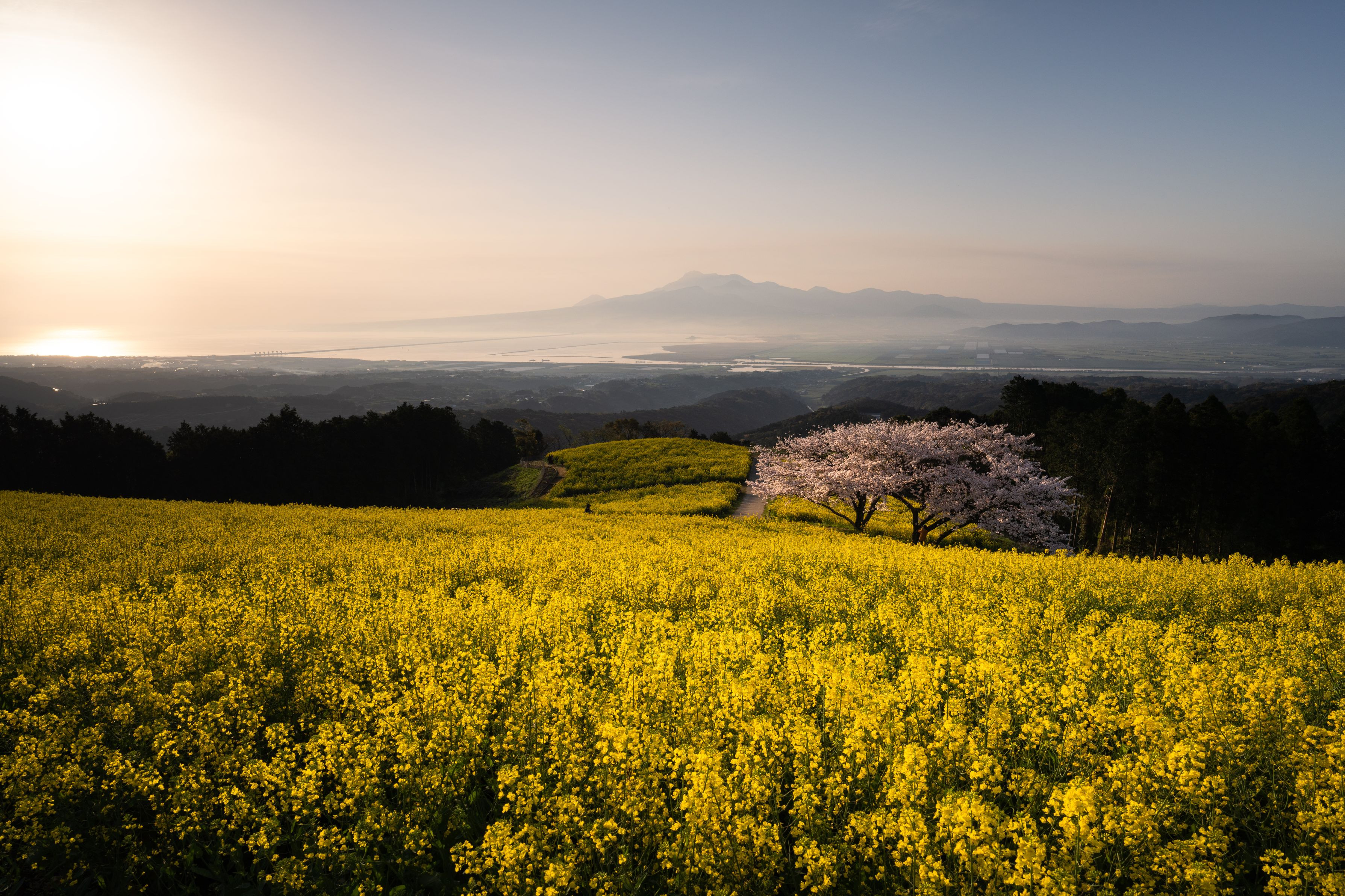 朝日が菜の花の絨毯と桜を照らし出した景色に、春の喜びを感じました。
