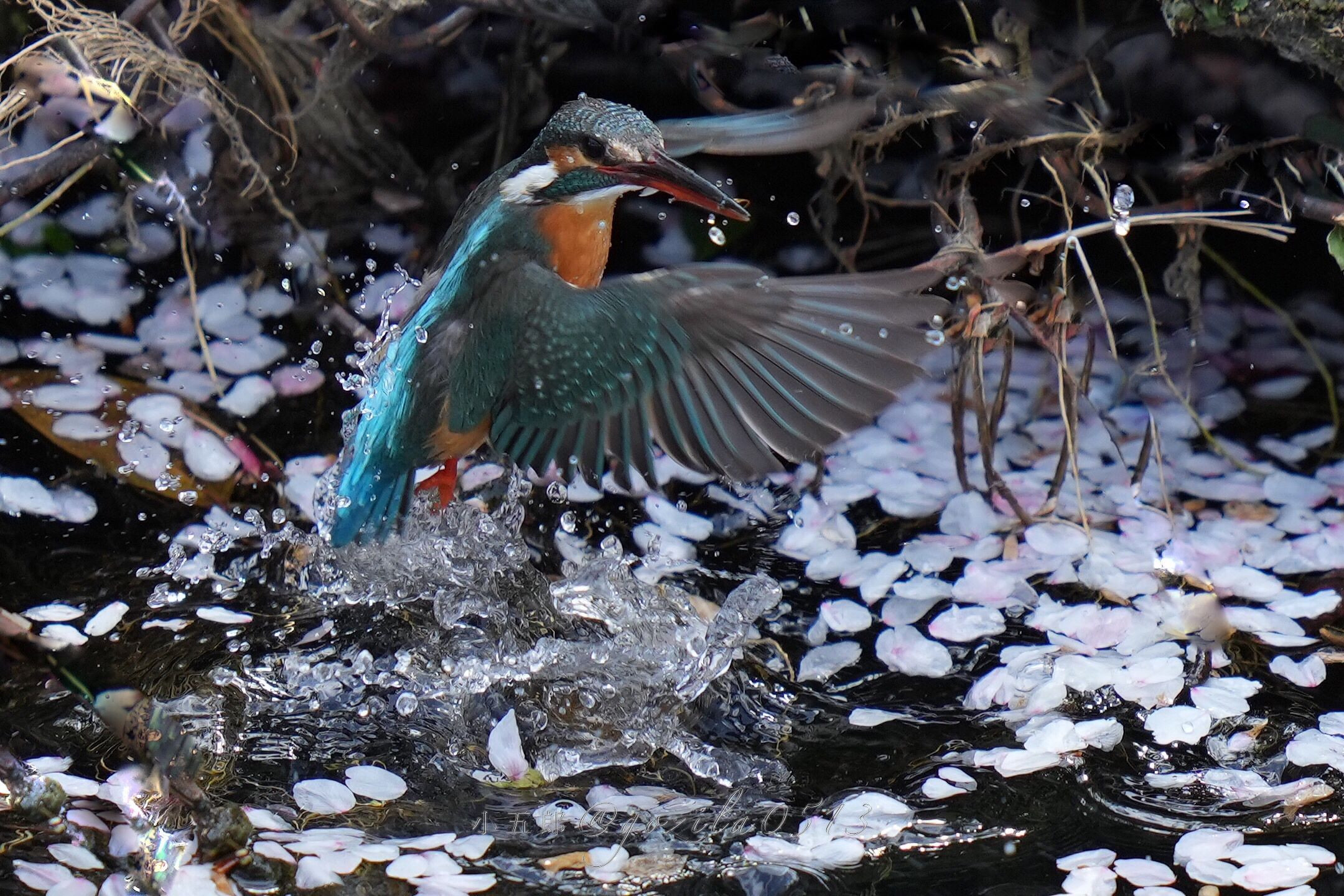 ソメイヨシノとカワセミさん 瀧とさくら吹雪とさくら筏