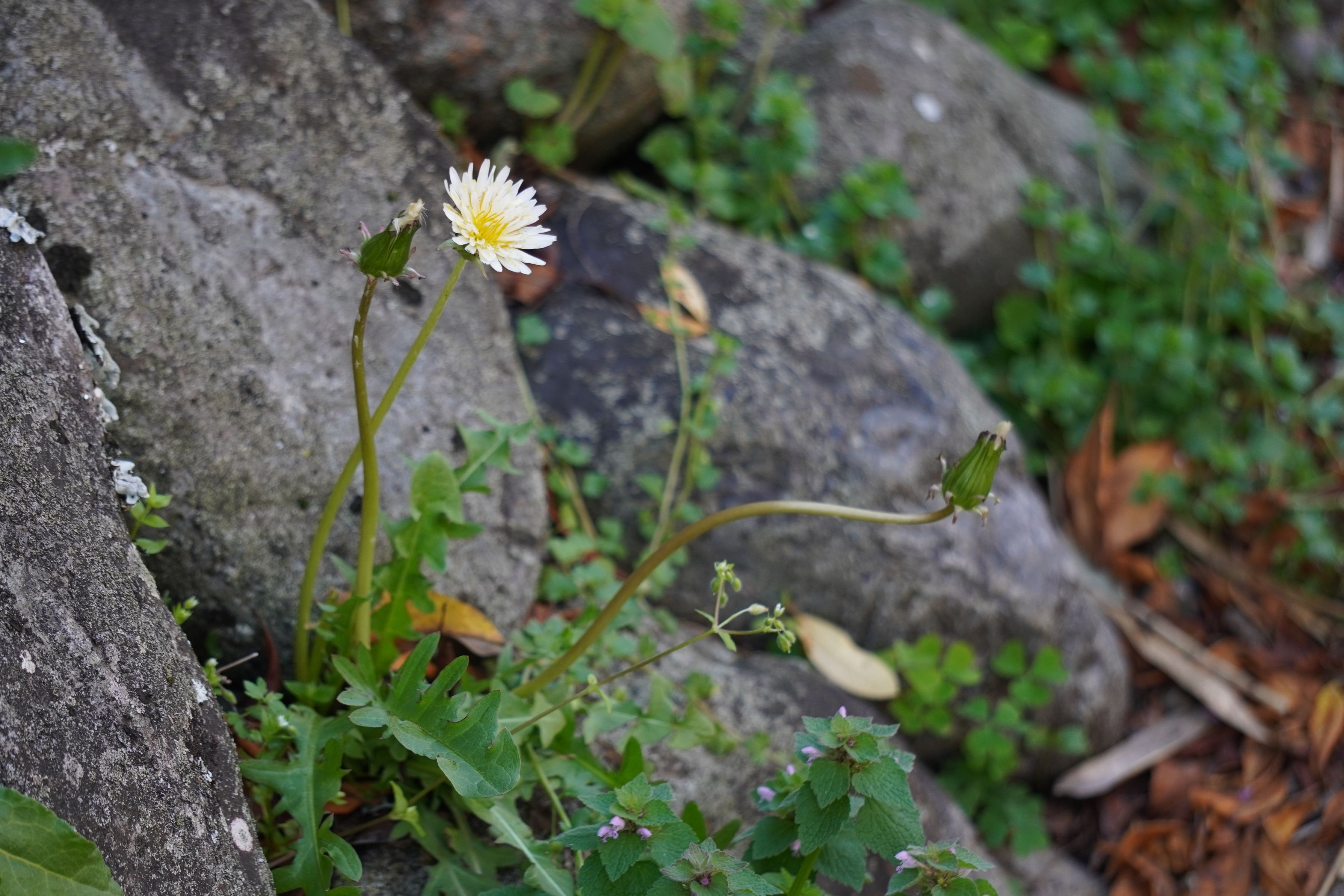 やっと会えました、ムラサキケマンと白花タンポポに。 二人とも日陰でひっそりと咲いていました。