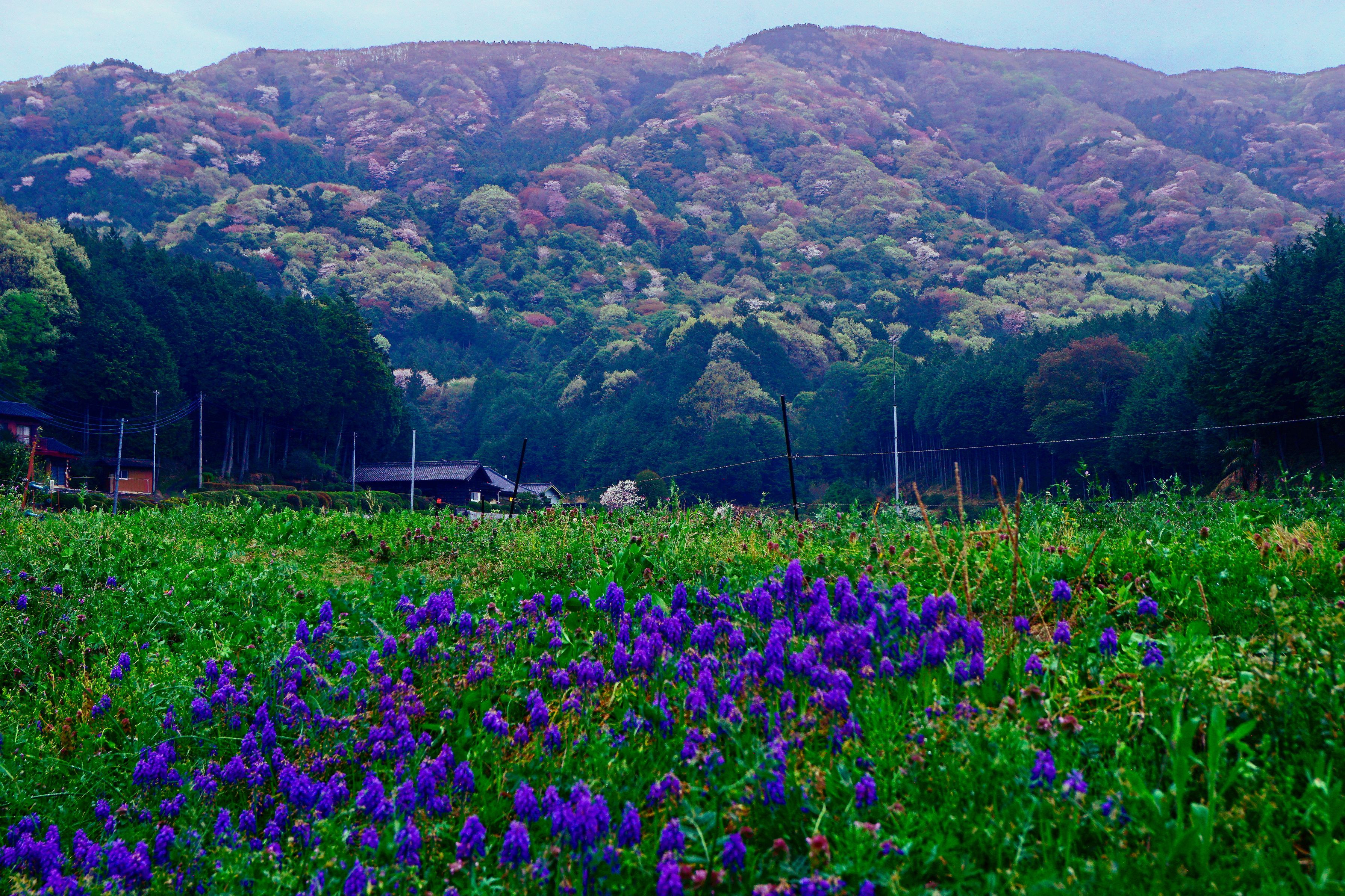 桜川市平沢 西の吉野 東の桜川と詠われる高峰山 雨の夕刻 ムヒカリを手前に添えて…