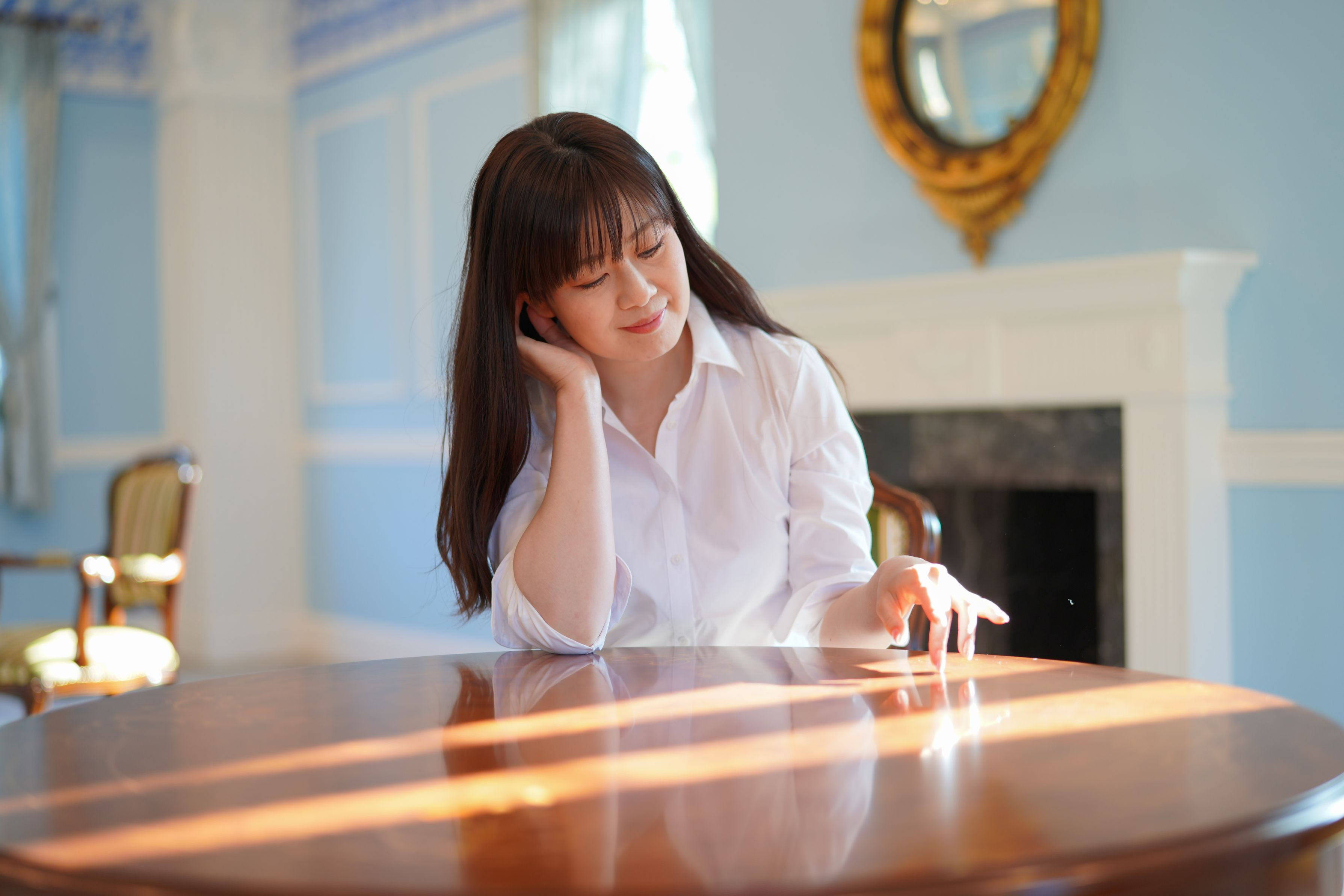 ウエッジウッドの間と名のついた部屋で撮影しました。 壁が水色で統一されており素敵な部屋でした。 モデル:アル