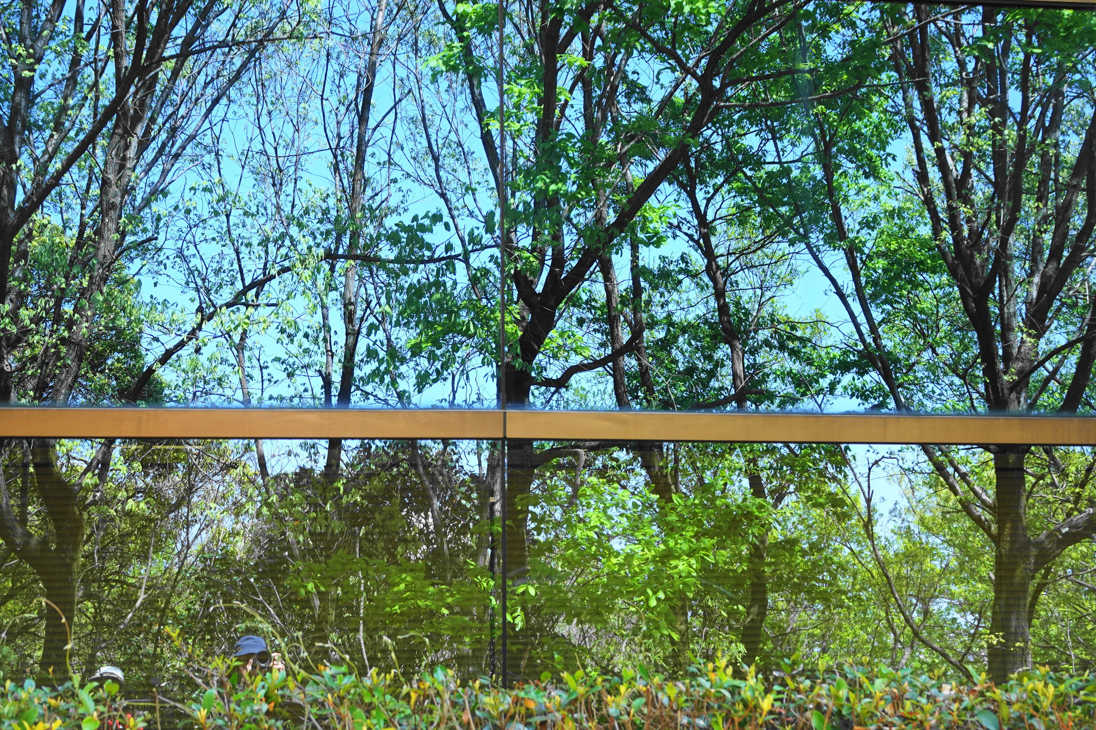 ビルのガラス壁に映った樹木です。 画面の左下にはカメラを構えた撮影者も映っています(ぜひ拡大してご覧下さい)。 名古屋市名東区の猪高緑地にて
