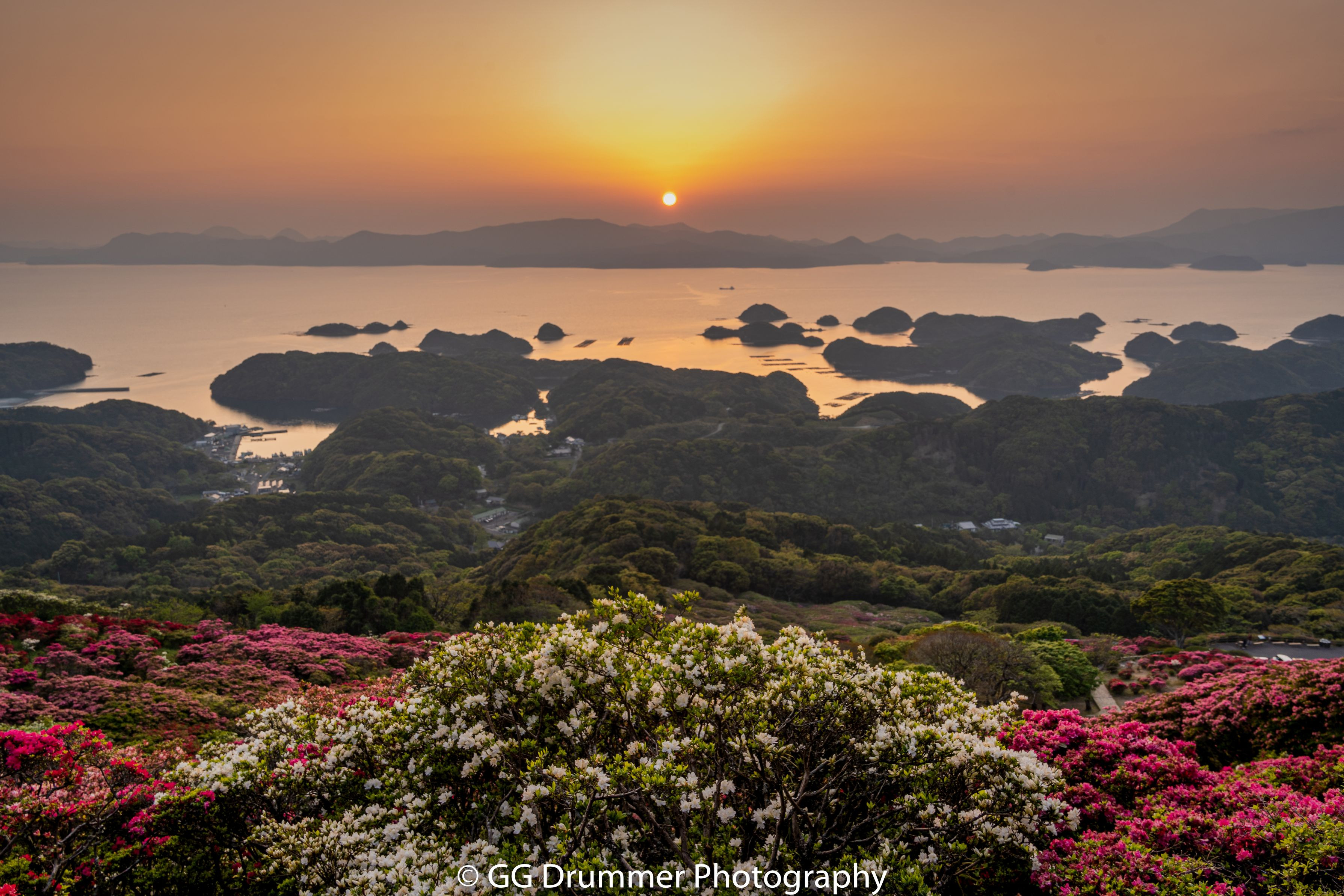 長崎県の名串山から九十九島に沈む夕日です。満開のツツジに西陽が当たって綺麗でした(^.^)