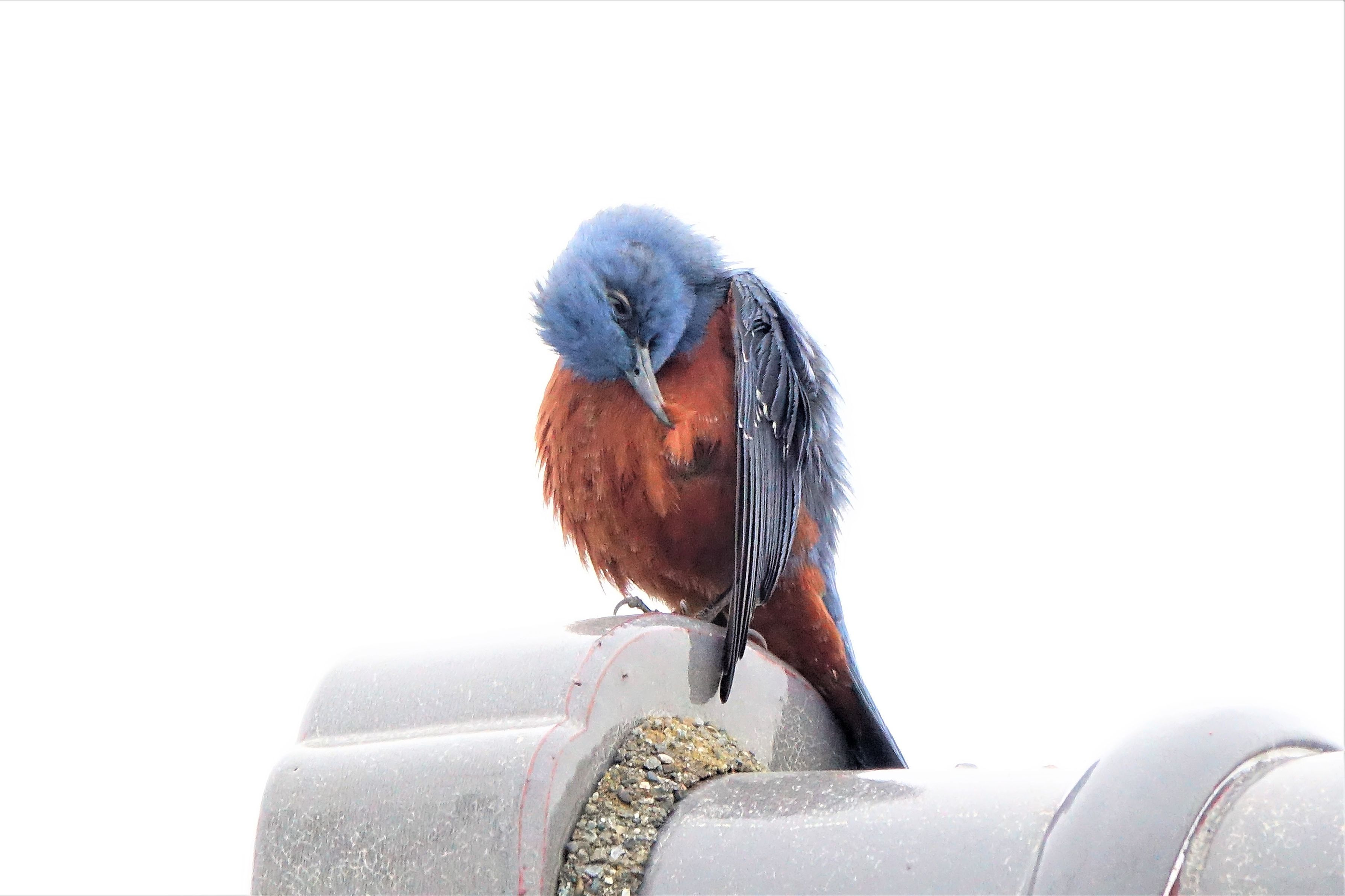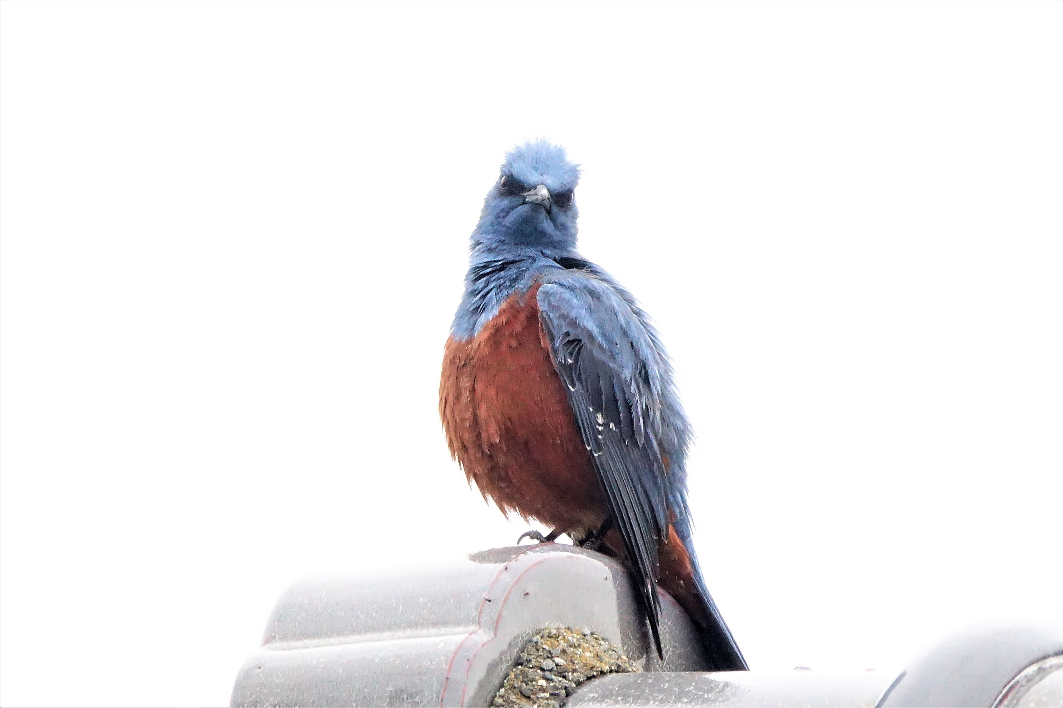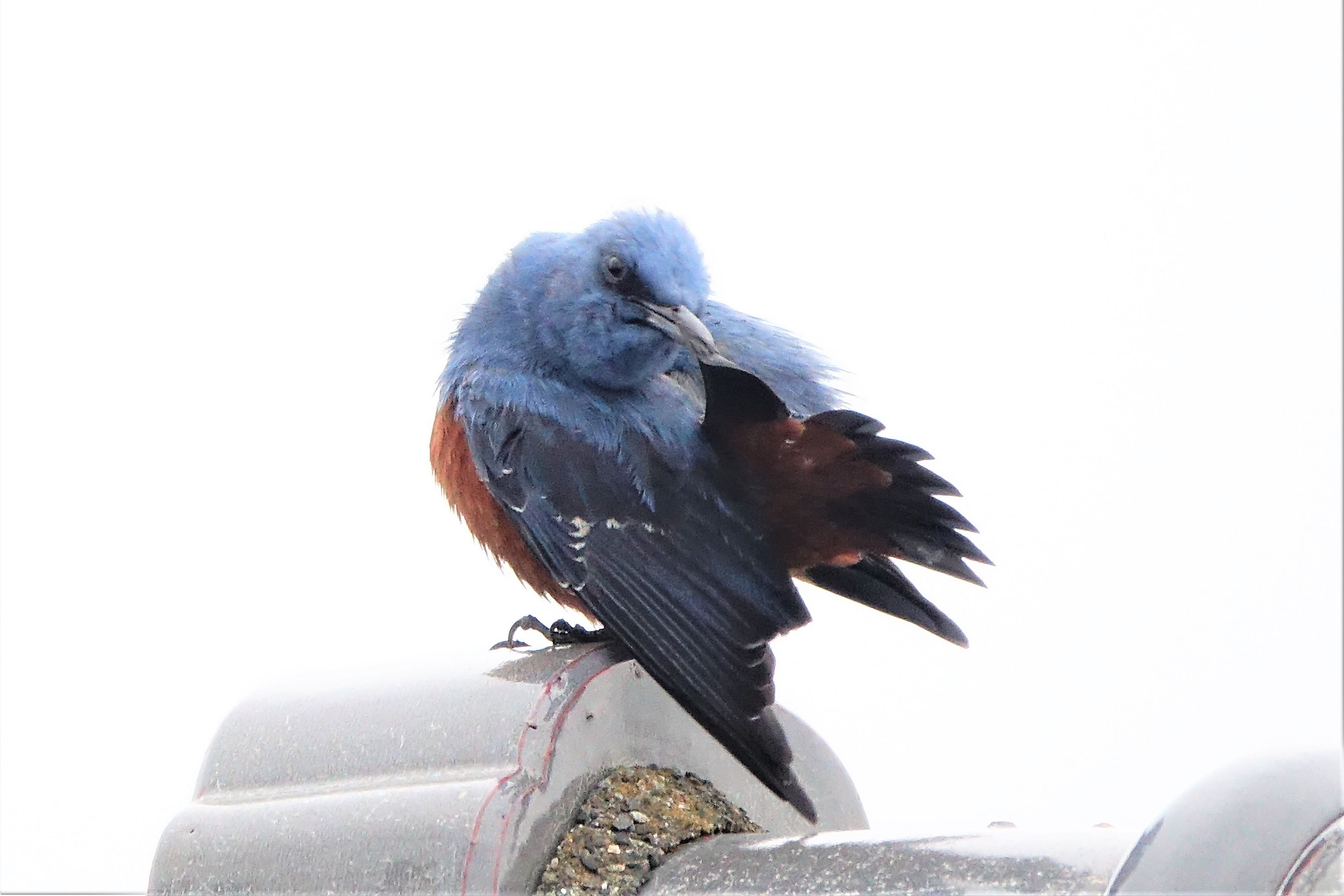 イソヒヨドリのオスが、縄張り争いで電柱のてっぺんにいる別のオスと1時間ほど、にらみ合いの喧嘩をしていました。電柱のオスが飛び去ったので、このオスが勝ったようです。その後、恐い顔をしたまま羽繕いを始めました。この恐い顔を見てやってください。地上では赤モミジの花が咲き、実を付けました。珍鳥もやって来ました。