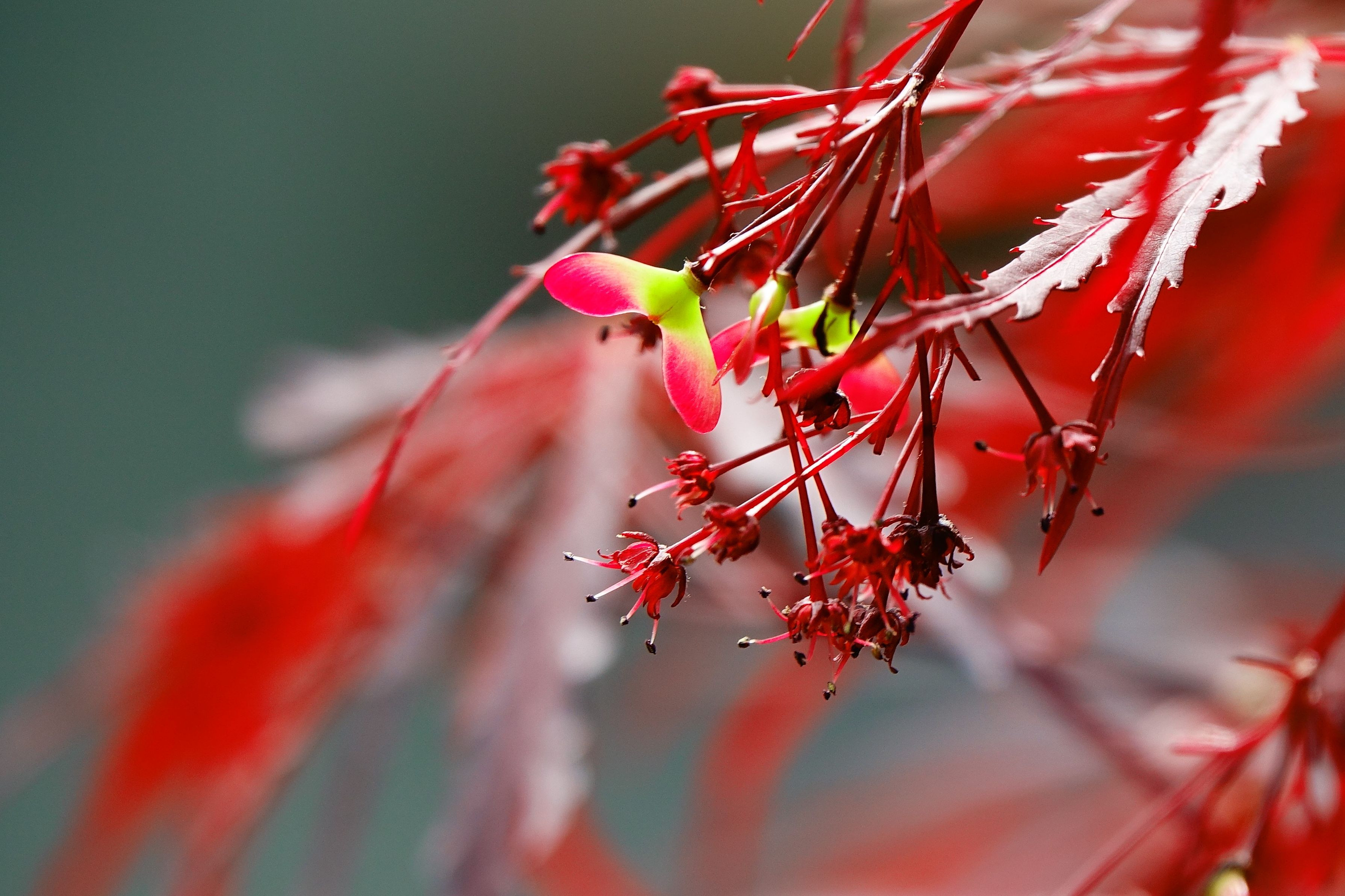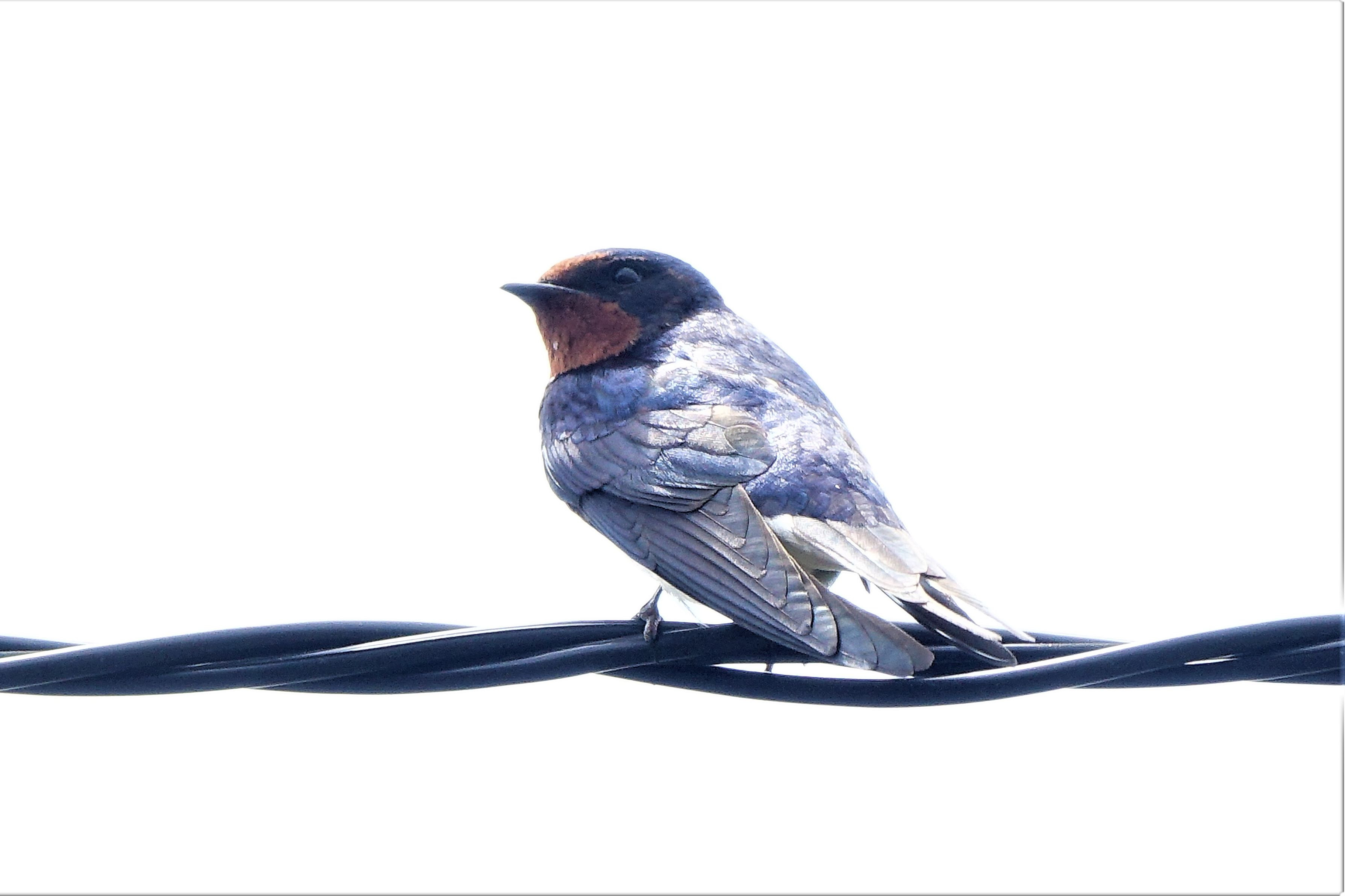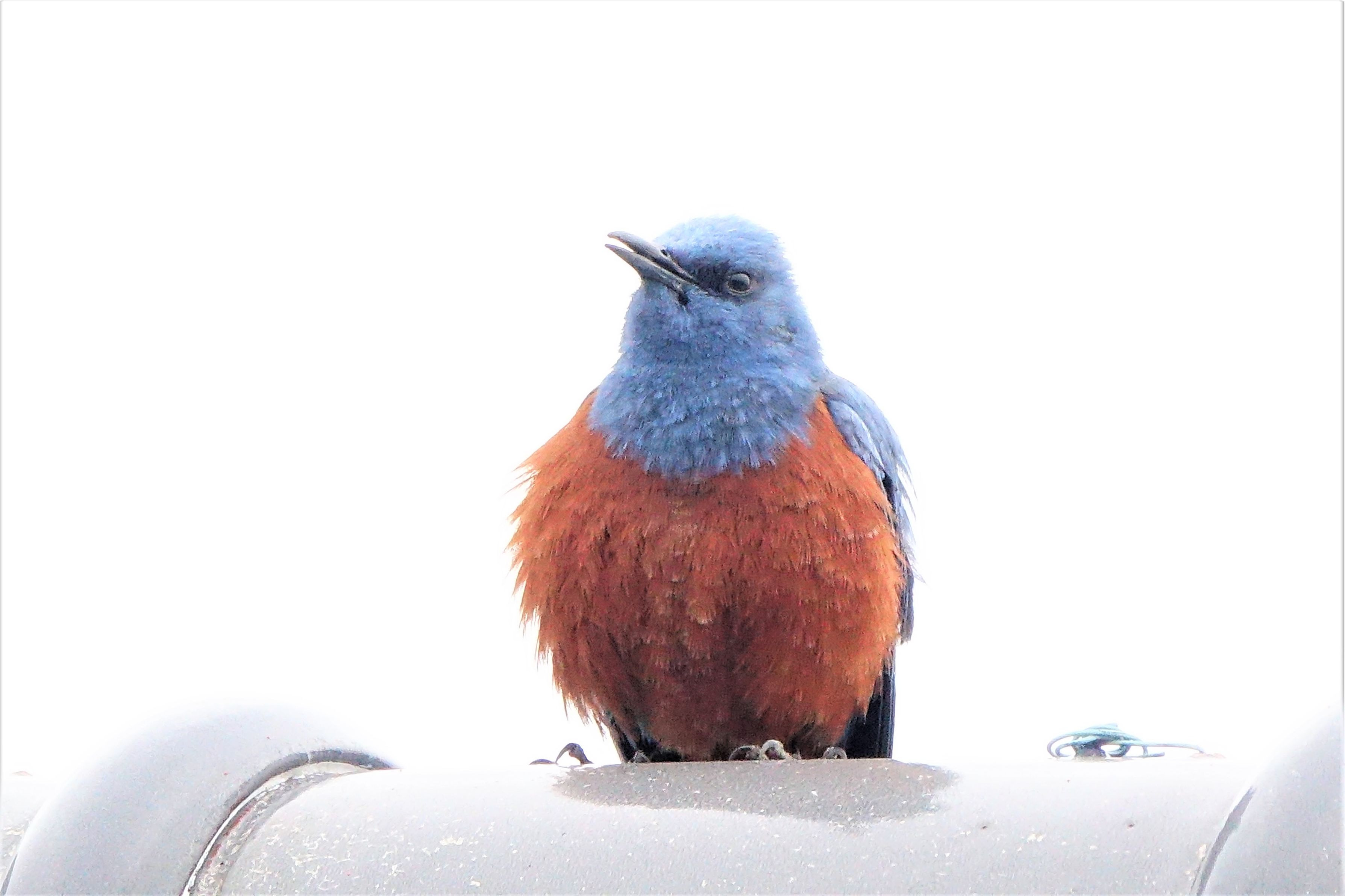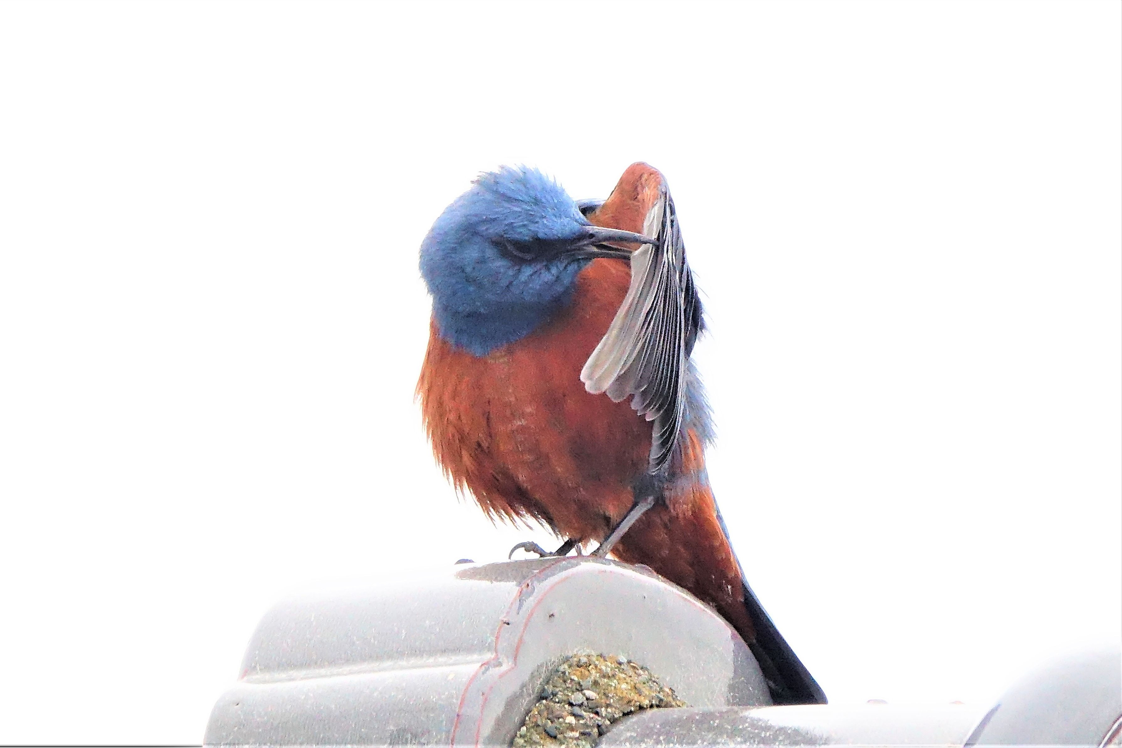 イソヒヨドリのオスが、縄張り争いで電柱のてっぺんにいる別のオスと1時間ほど、にらみ合いの喧嘩をしていました。電柱のオスが飛び去ったので、このオスが勝ったようです。その後、恐い顔をしたまま羽繕いを始めました。この恐い顔を見てやってください。地上では赤モミジの花が咲き、実を付けました。珍鳥もやって来ました。
