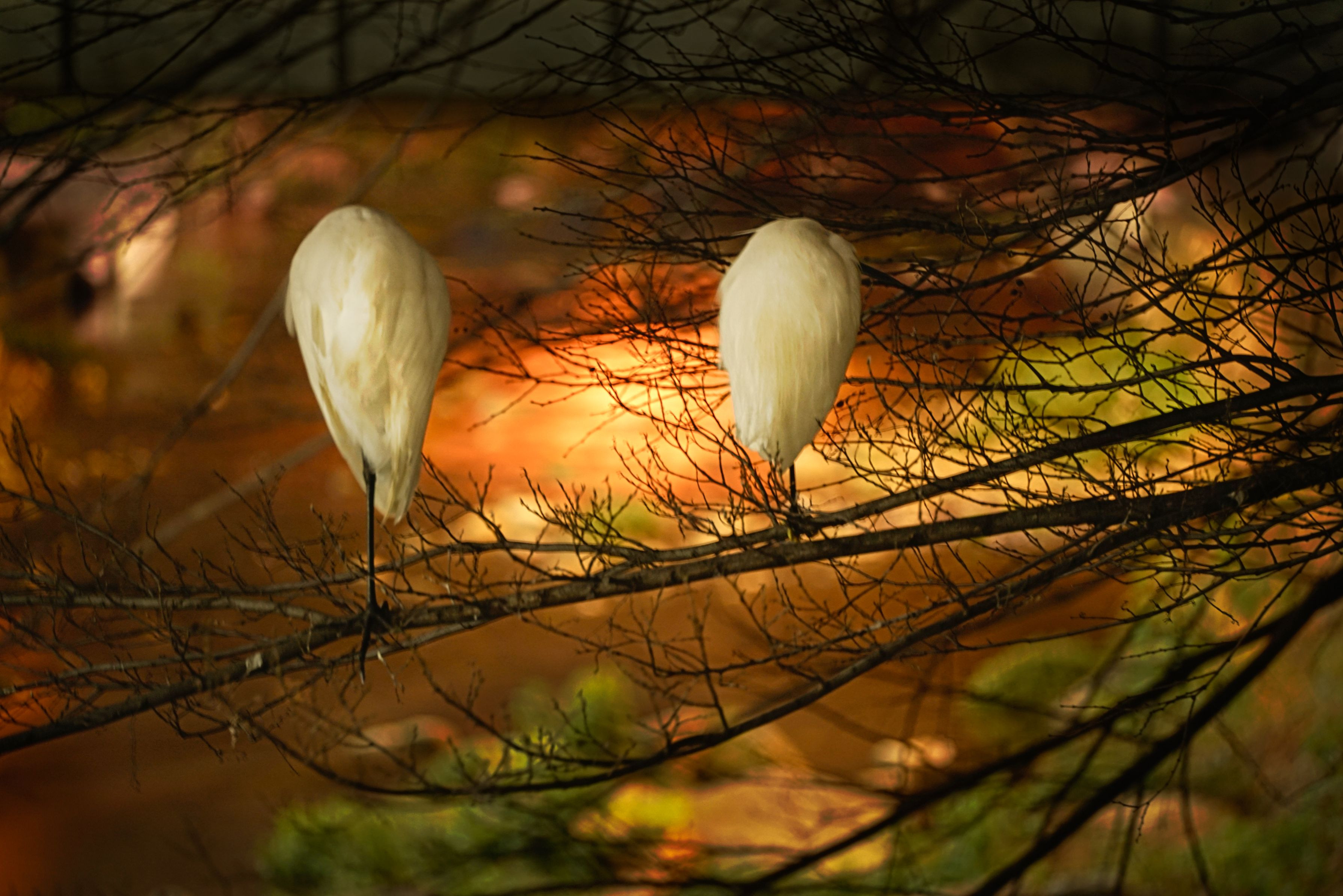 枝で眠るサギです。 電車の鉄橋の横に大きな木があり、数羽のサギが毎晩の寝ぐらにしていました。片足で枝に立って顔を羽の中に畳み込んでいるようです。 街の中なので道路の照明が川に反射しています。