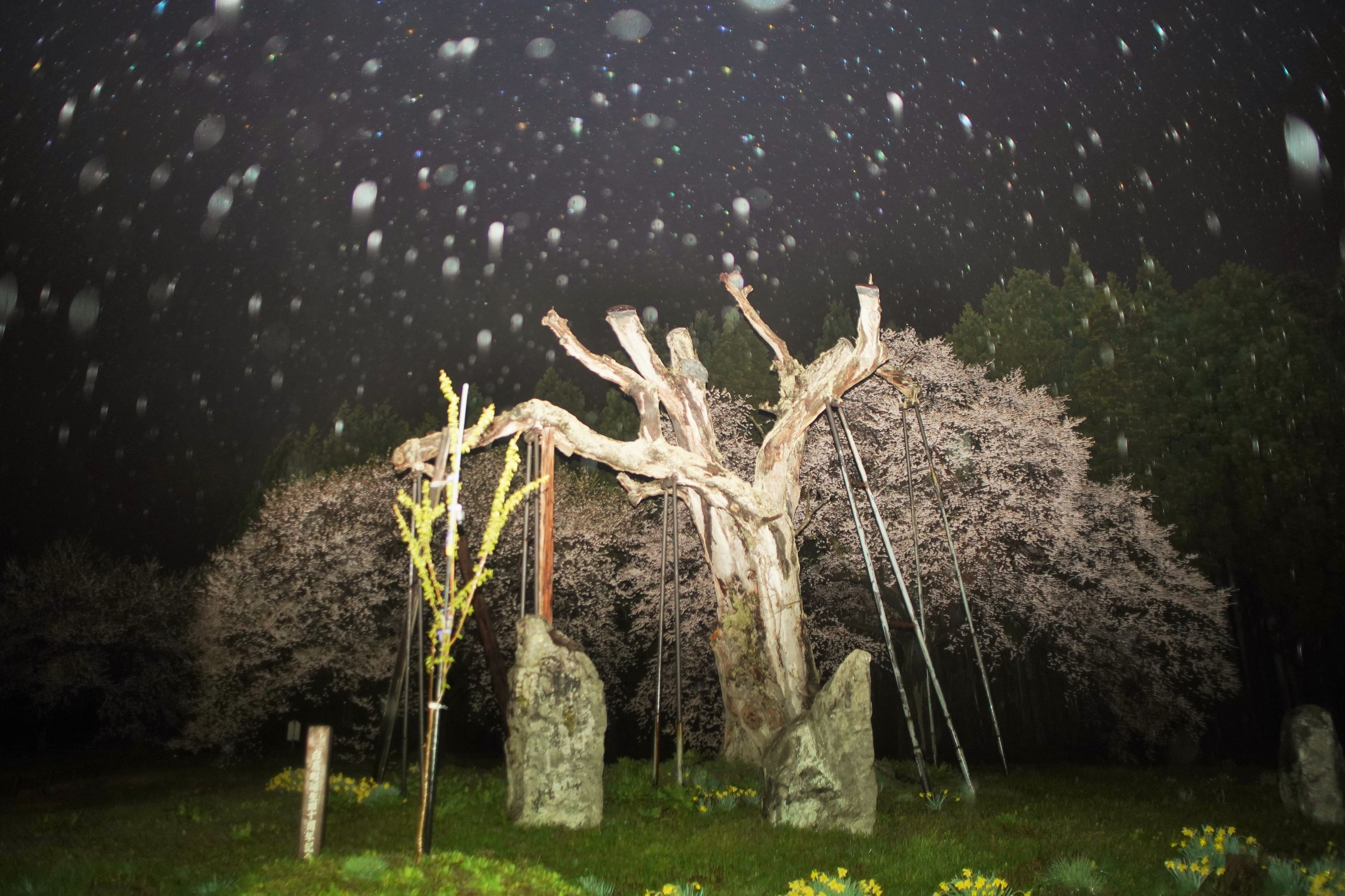山形県の置賜さくらロードにある「釜の越桜 」です。雨の夜にフラッシュを焚いて、幻想的な雨粒を加えました。