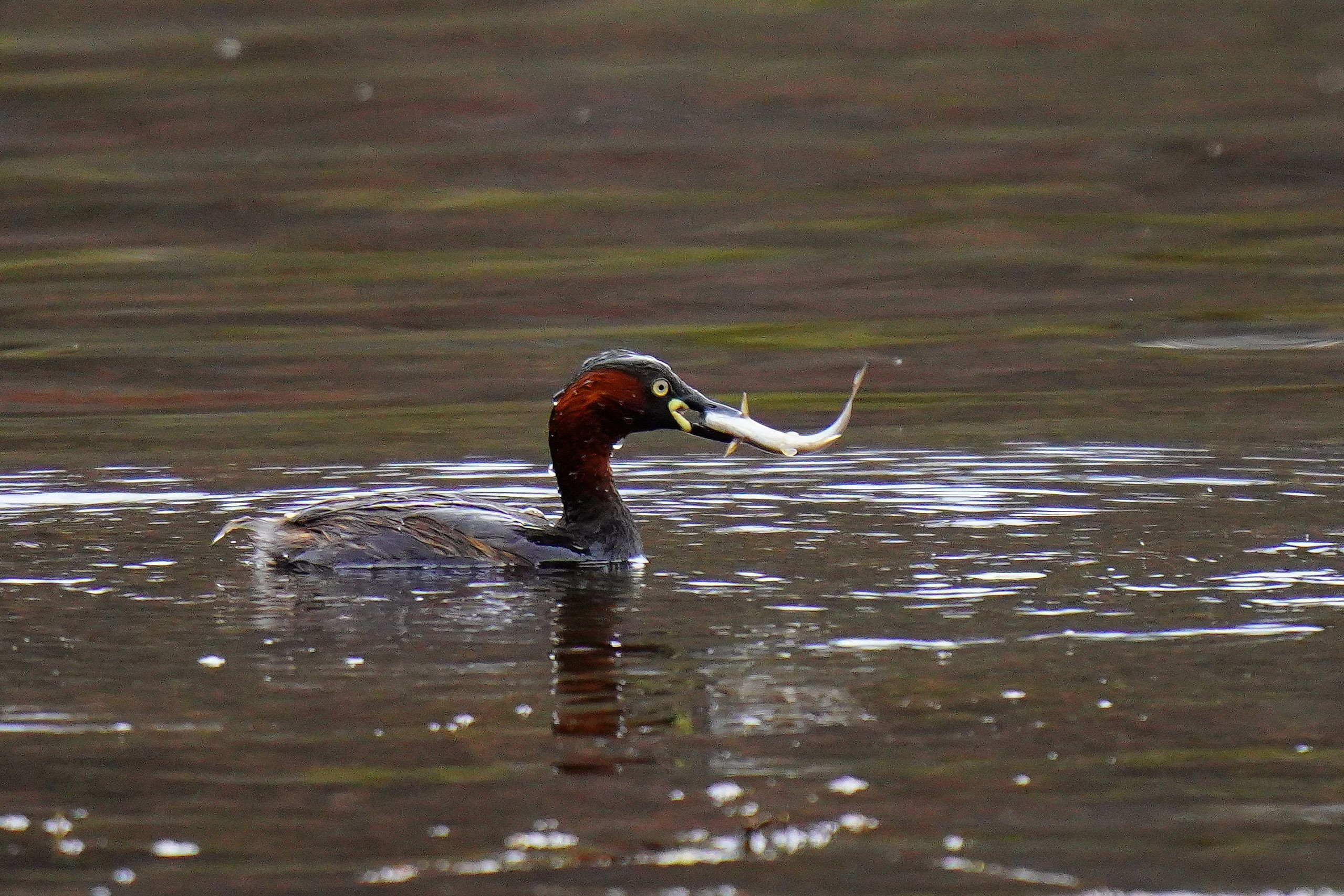 カイツブリが水中に潜り、大きな魚をゲットして浮上しました。
