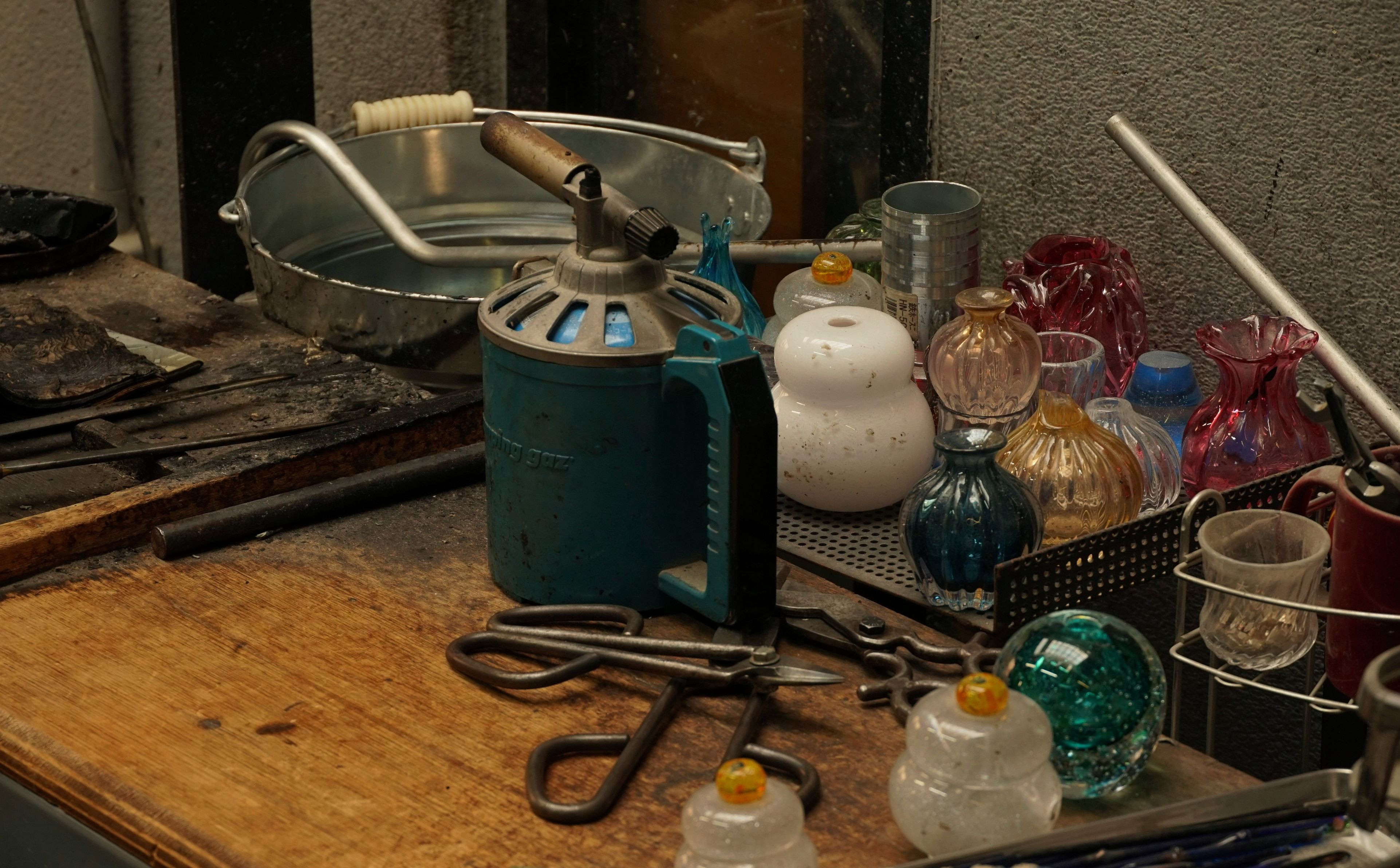 友人のガラス工房にて創作活動を見学。ひとつの作品を生み出すまでには、様々な工程や多くの失敗があることがわかりました。 この写真は、いつも腰かけて作業する場所を写したものです。