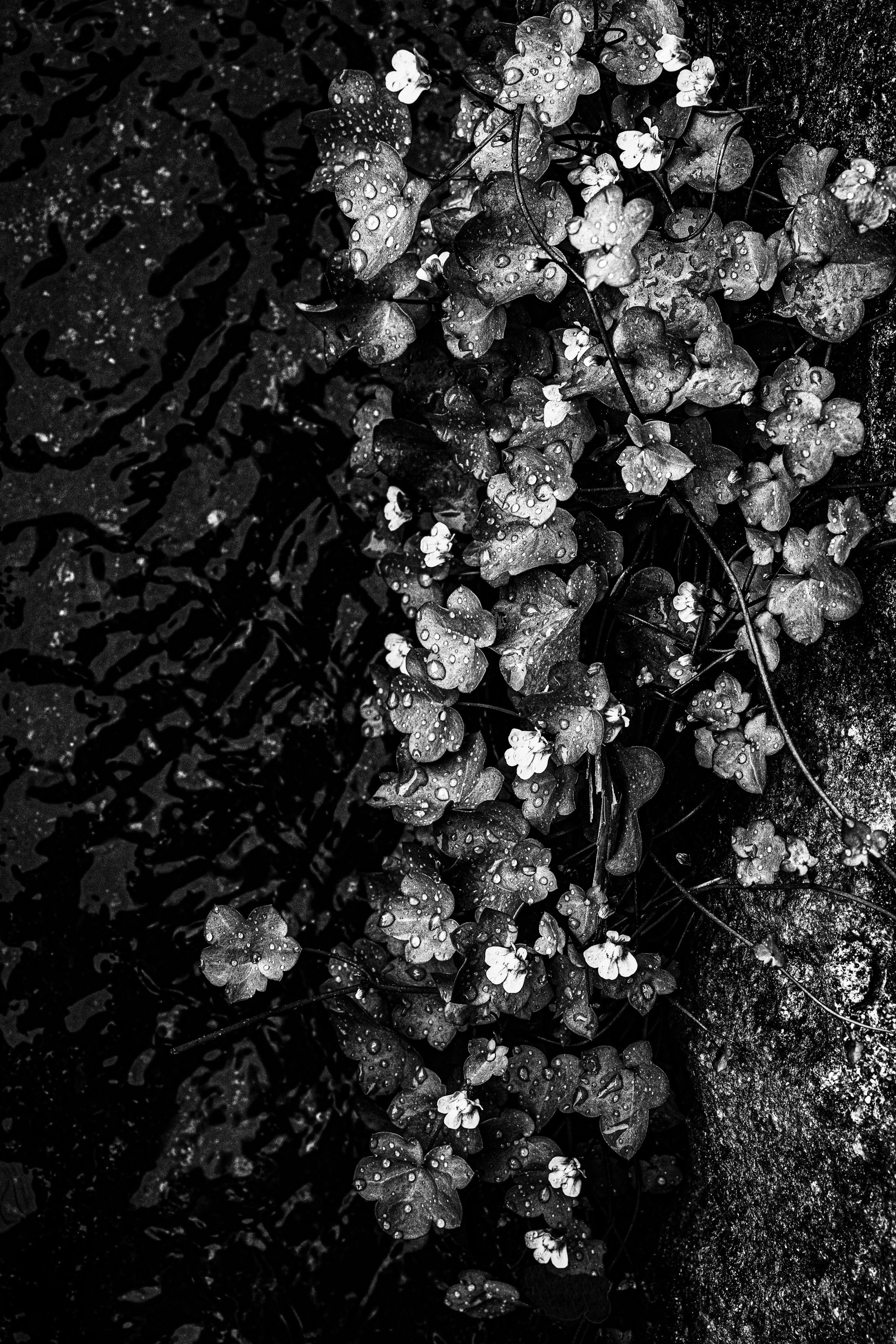 私は、コンクリートの間や壁の間に逞しく咲く野花が大好きです。中でも「蘭科」なのに、とても小さい「フタバウンラン」が一番好きです。雨の効果で、なんとか作品に出来ました。雨もたまにはいいですね。