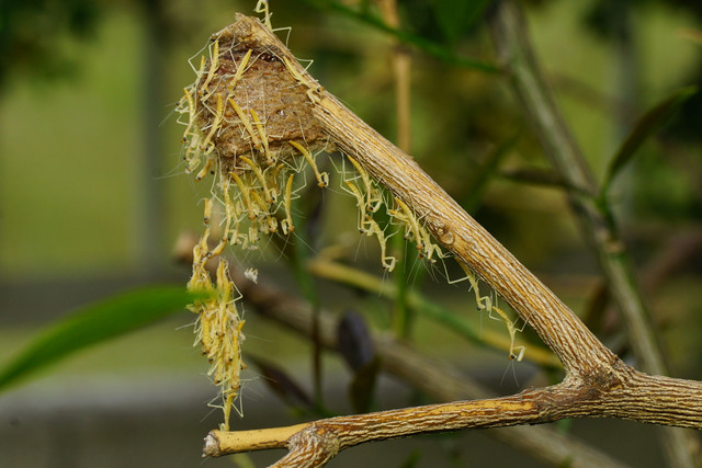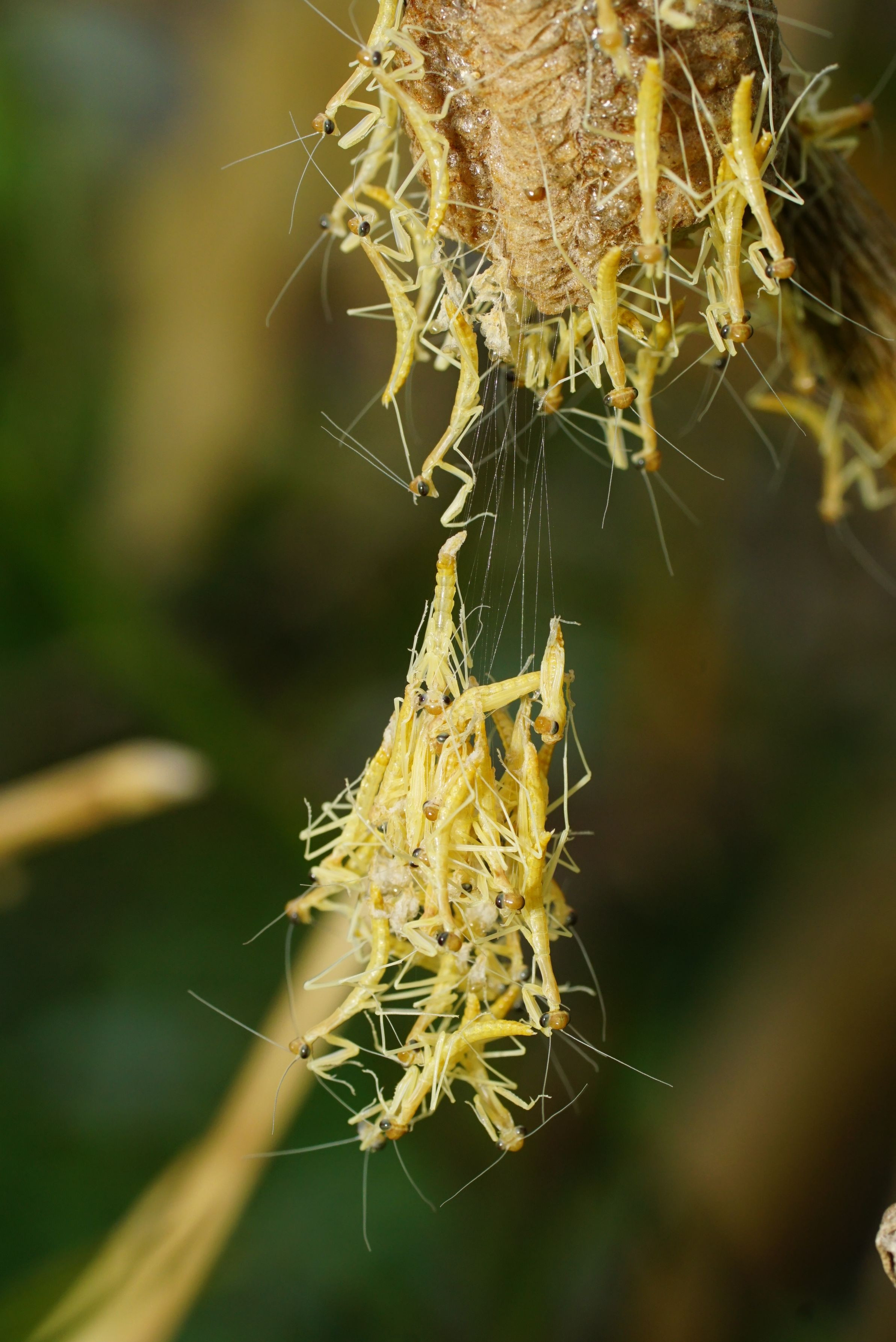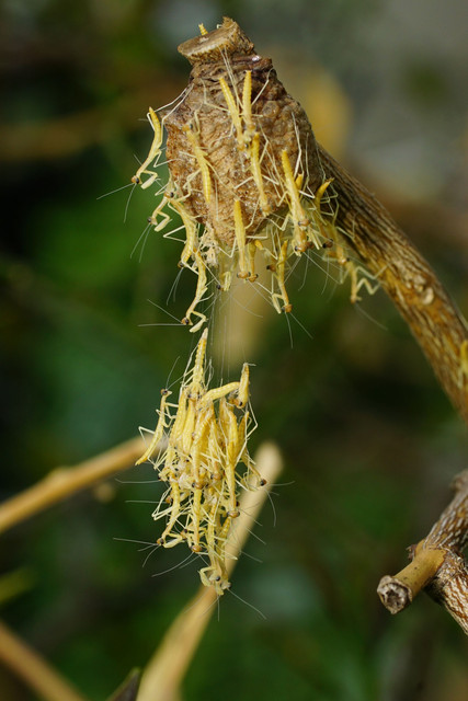 雨が降り出した庭先のレモンで、3回目の孵化を迎えたオオカマキリ。