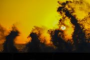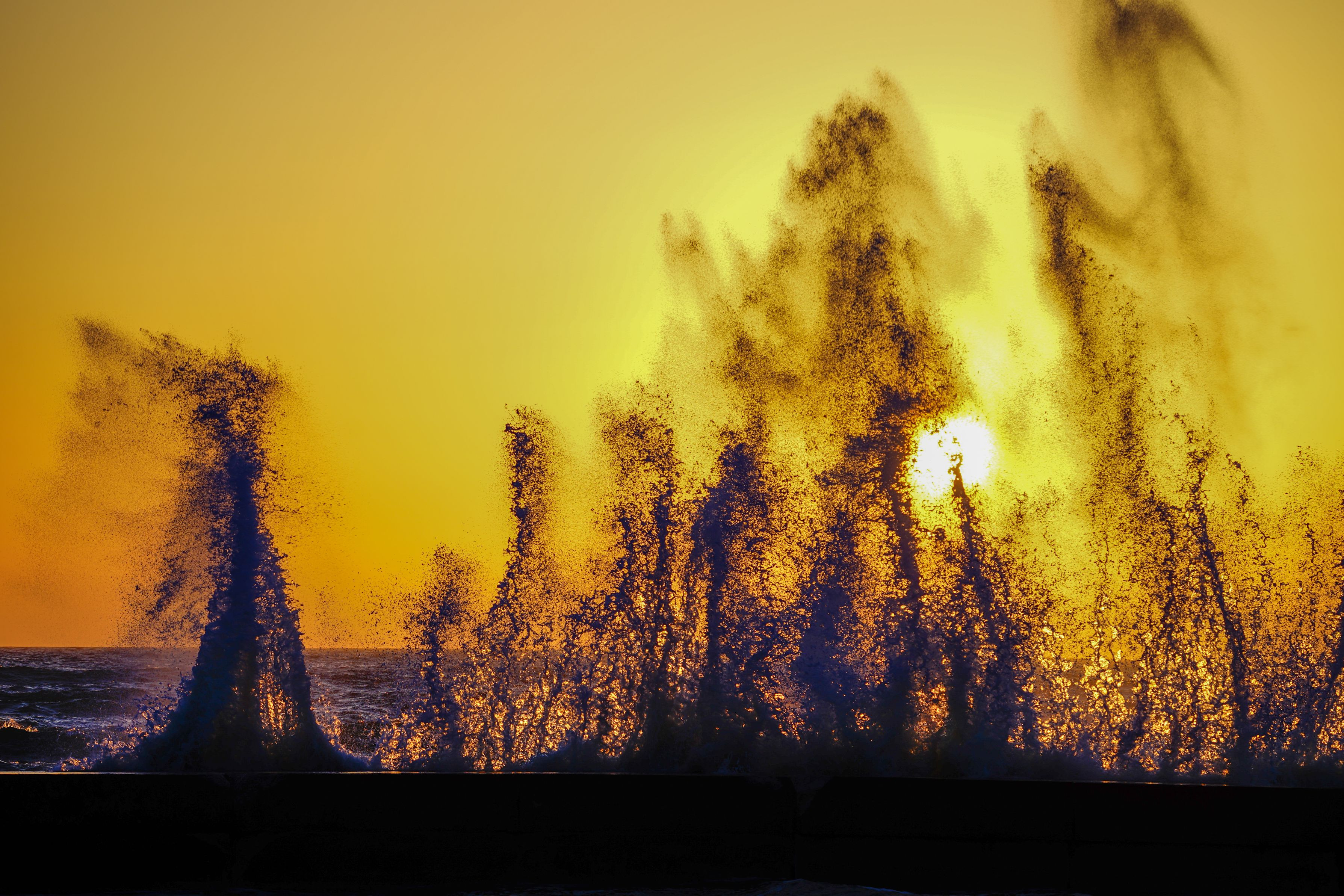 夕陽が波しぶきを照らし、波しぶきは夕陽を映し出す。 良い関係ですね