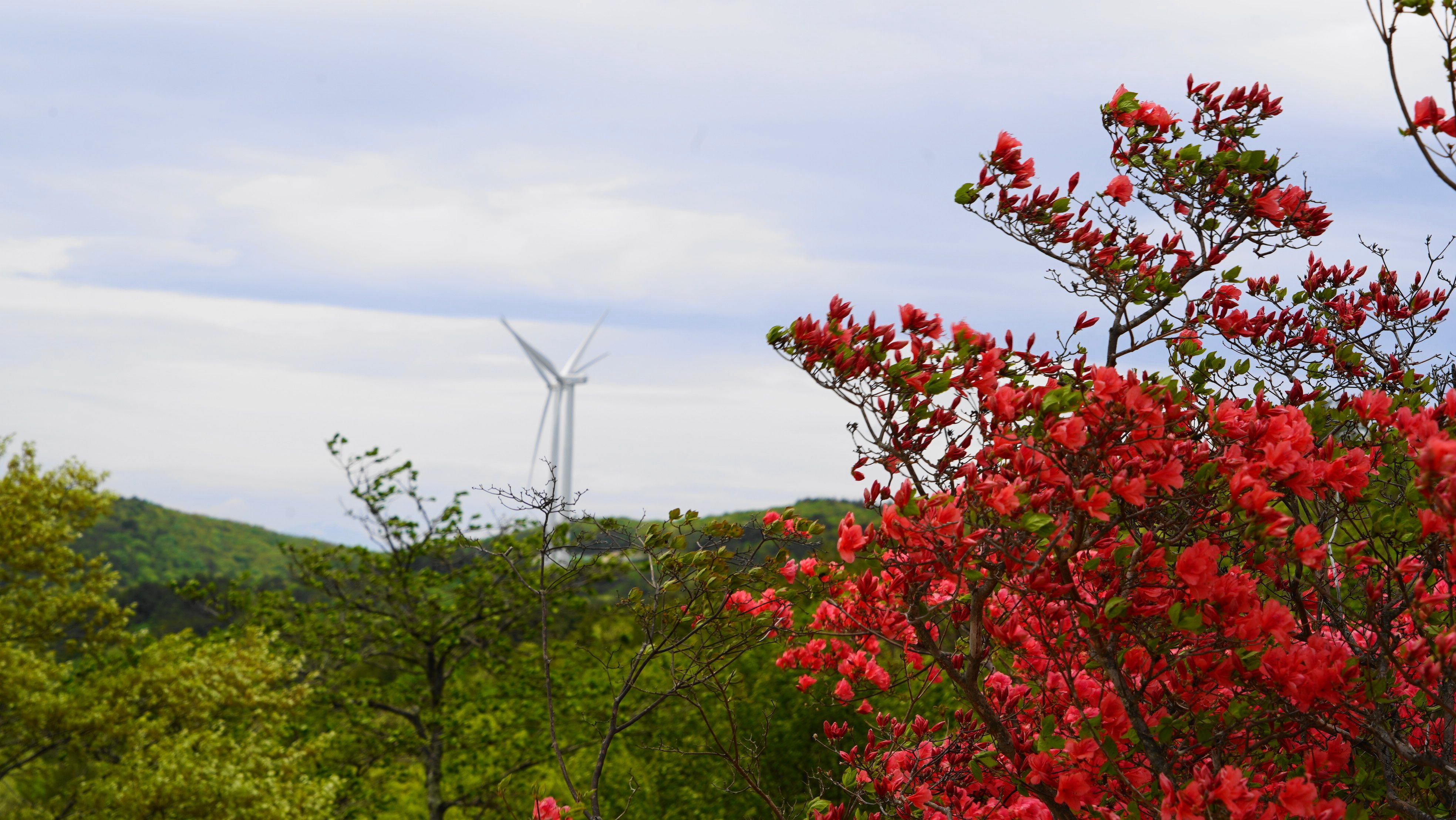 山の中のツツジ畑に行ってきました。 その際、風力発電所が見えたのでコラボ撮影
