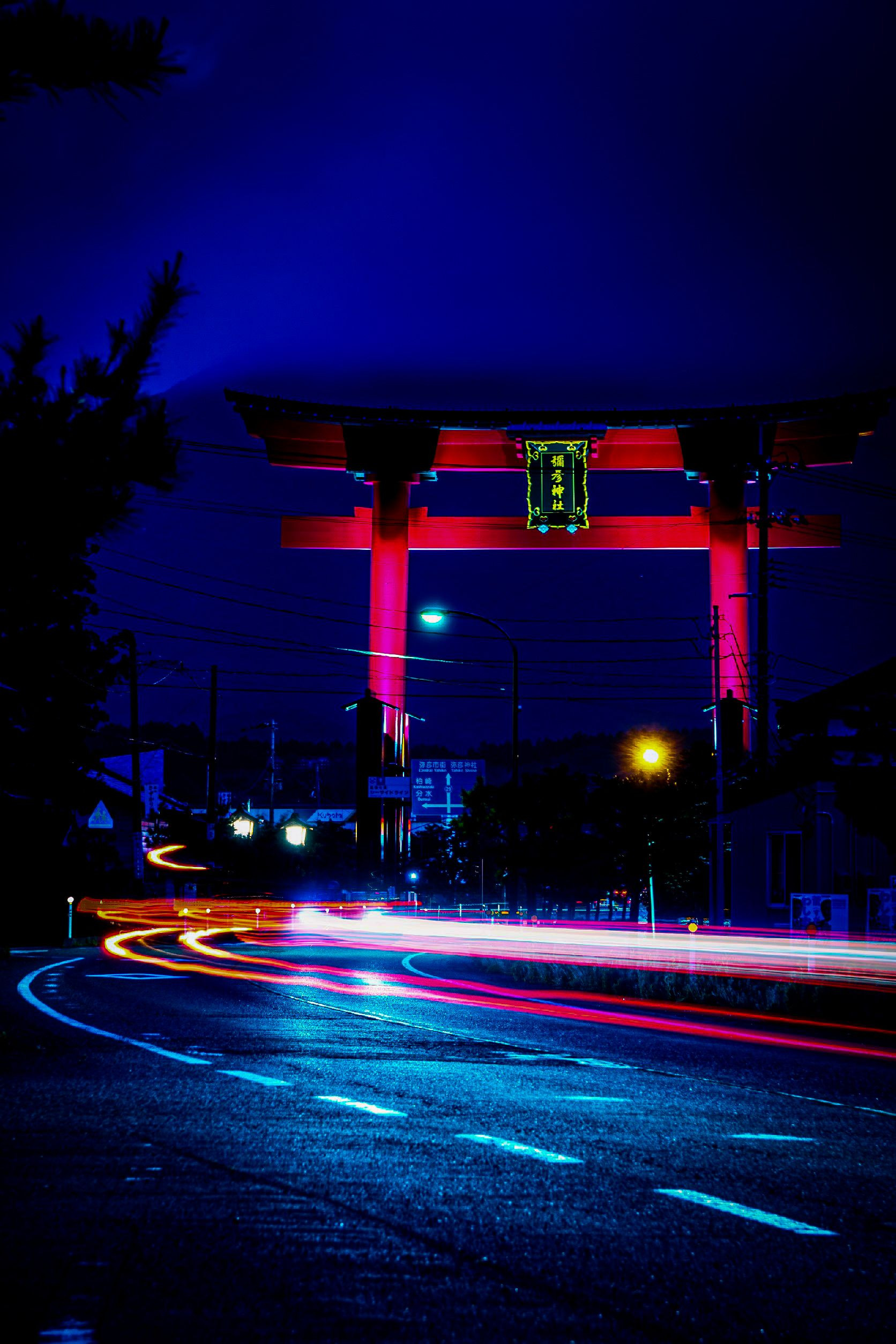 新潟県の弥彦村で撮影した写真です。 弥彦大鳥居を主題にしつつ、そこへ向かう車のライトの軌跡を撮影してみました。