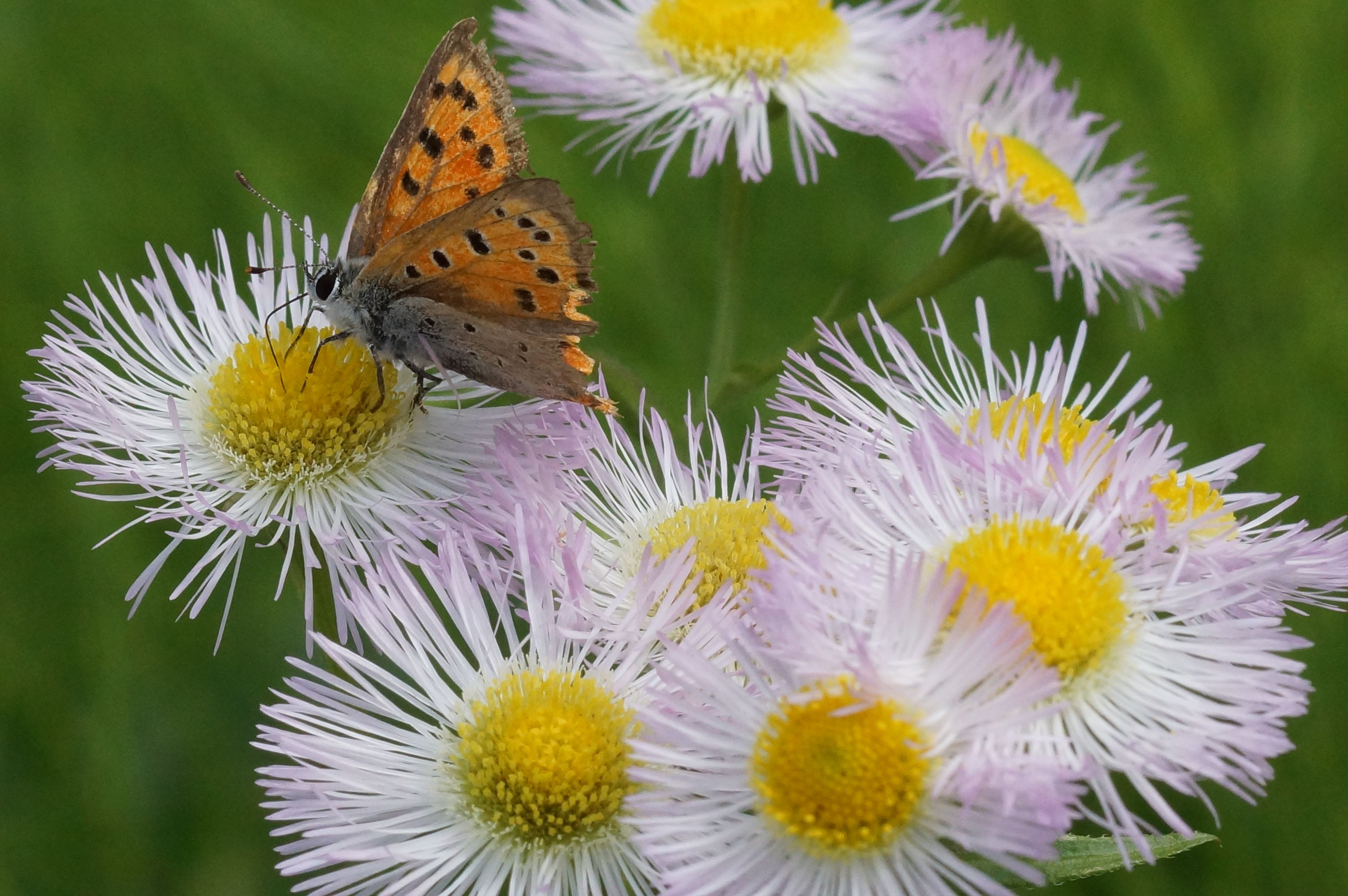 ハルジオンの花に一頭のチョウが夢中になって蜜を吸っていました