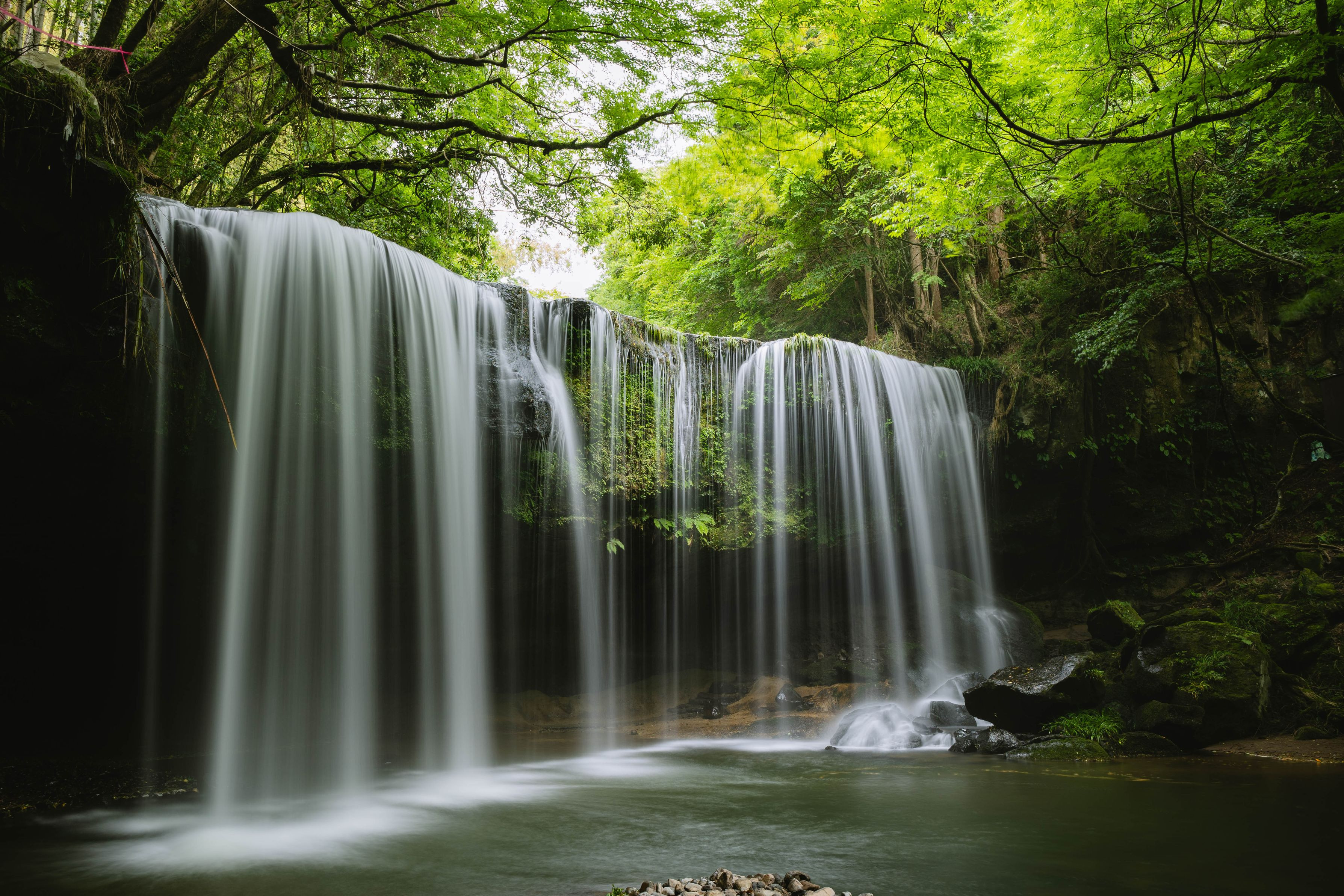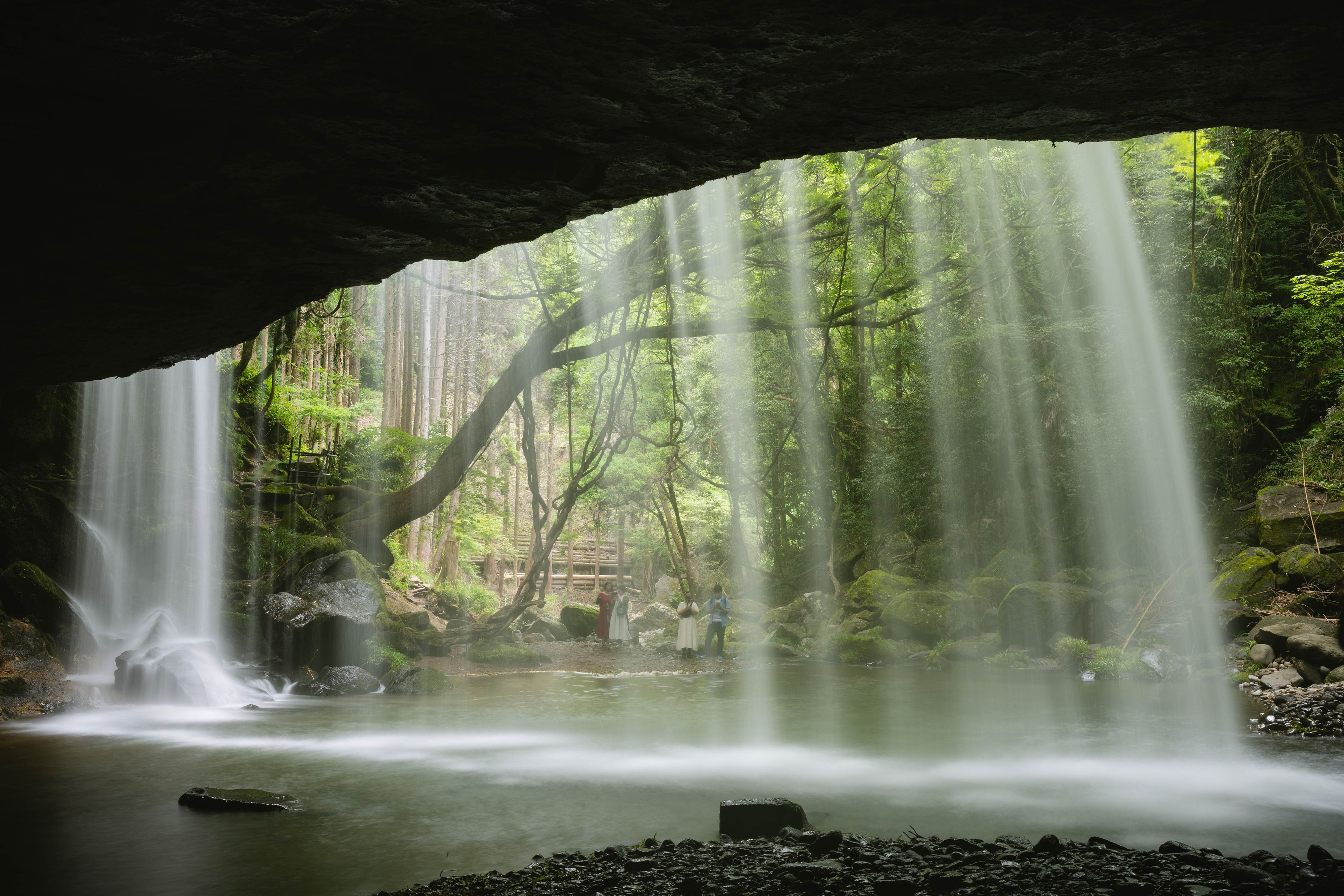 熊本県・鍋ヶ滝です。CM撮影地としても有名で滝の裏に入ることができる珍しい滝です。