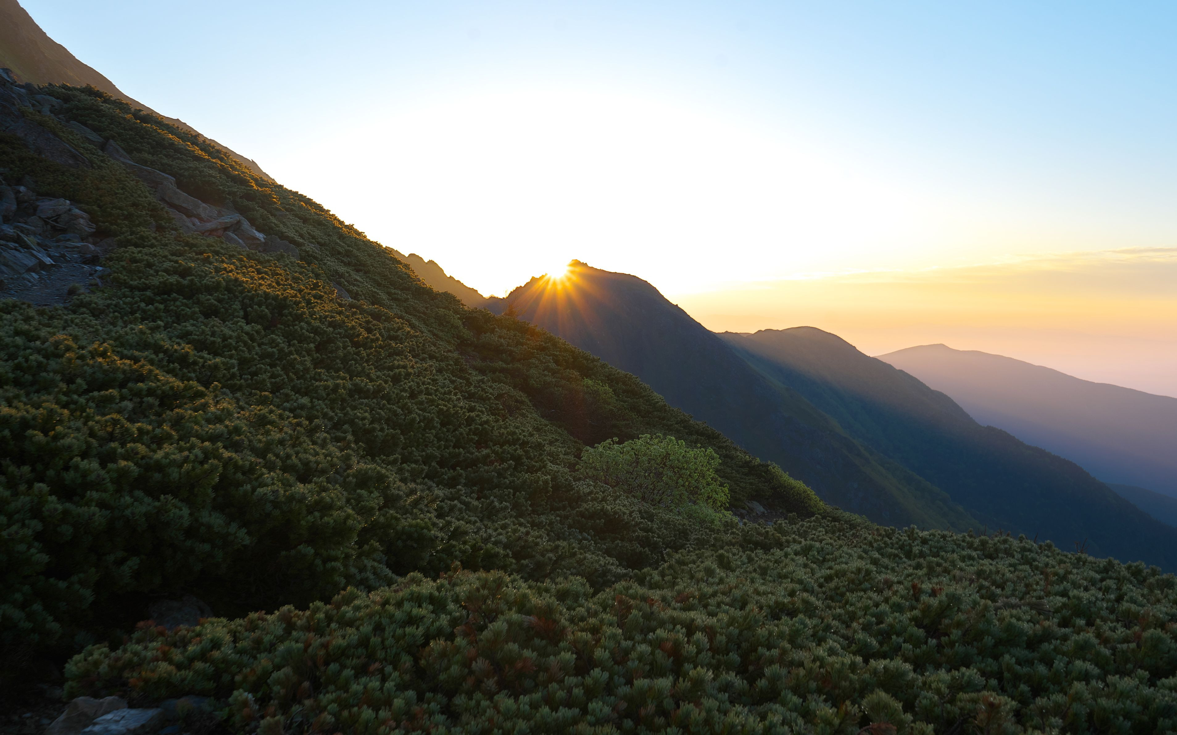 南アルプス北岳への登山道の途中にある八本歯の頭というピークから登る太陽。 撮影は北岳山荘からです。 台風接近の中、雨覚悟で登った北岳。びっくりの朝日でした。 完全に山頂からの日の出じゃないのが残念です。