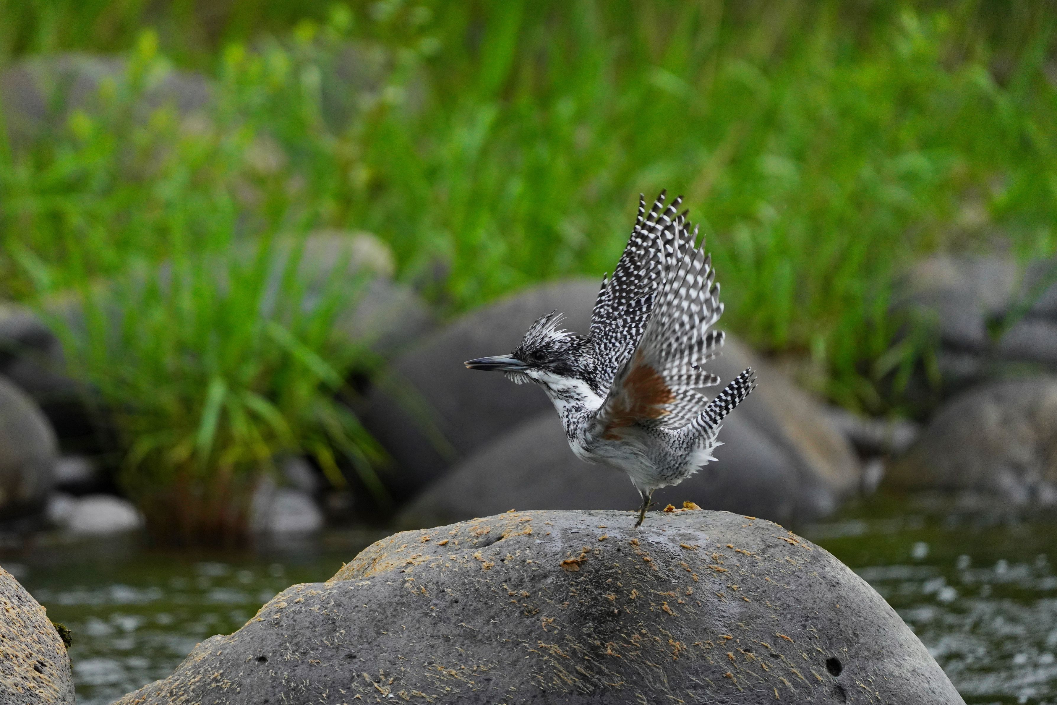 ヤマセミ(♀)がカラスの姿を発見し緊急発進しました。