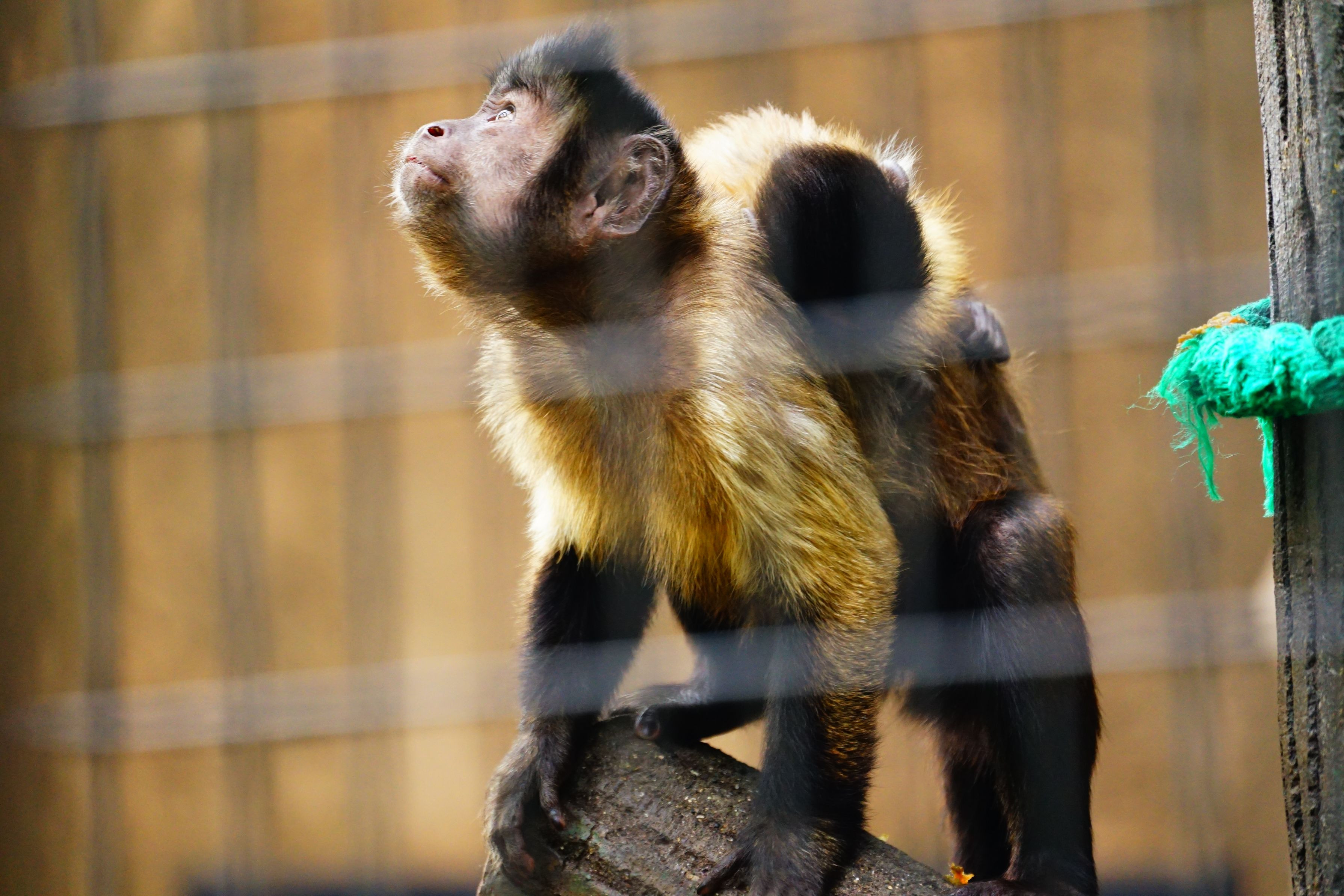 フサオマキザル(生息地南アメリカ)の親子です。子猿は爆睡中。 高い知能を持ちクルミ7など割って食べる事ができると記載。野毛山動物園