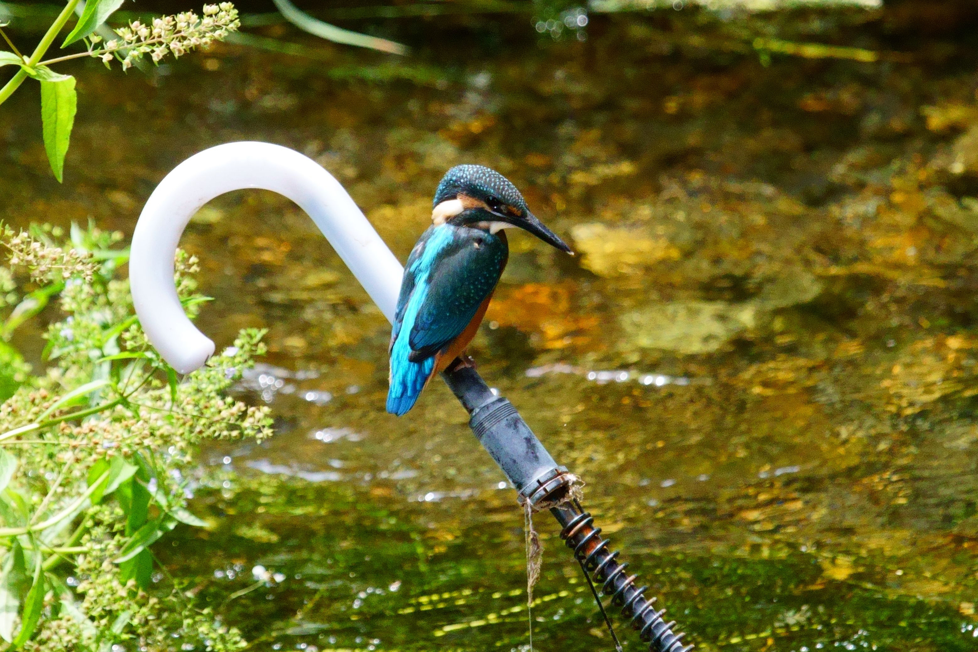川に落ちていた傘の柄にカワセミが偶然にも止まったので撮影しました。