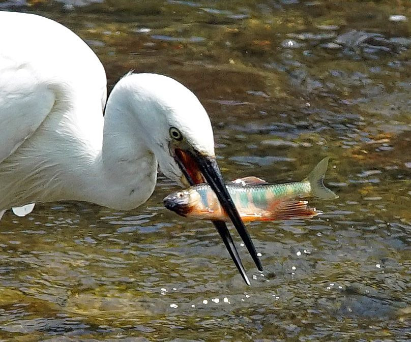 空梅雨で川の流れも痩せ細っていた。 コサギがオイカワの群れを追い回し婚姻色の大きなオイカワを 捕獲した。