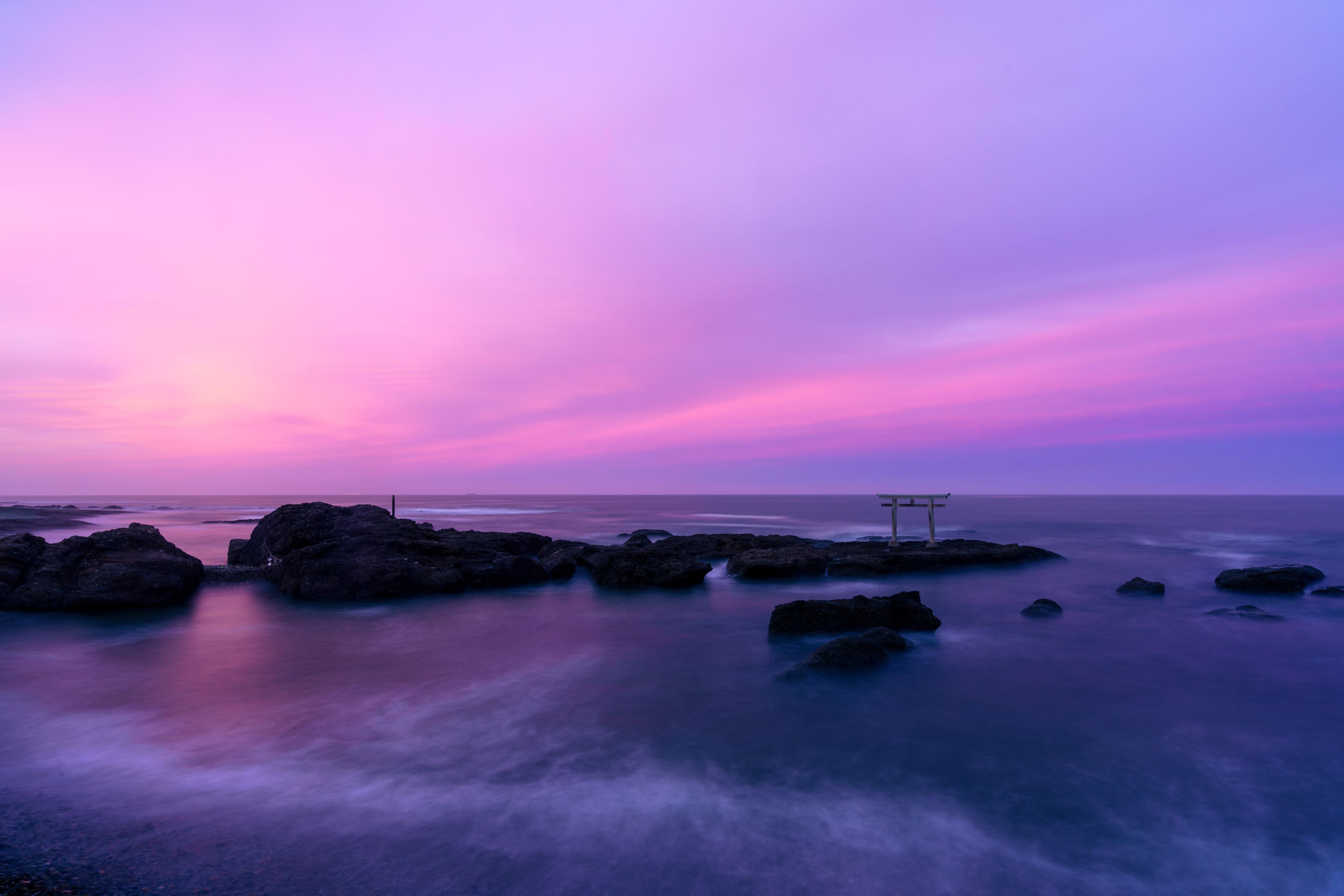 夕方、反射光でピンク紫に空が染まりました。 そこに浮かぶ大洗神磯の鳥居がとても神秘的でした。