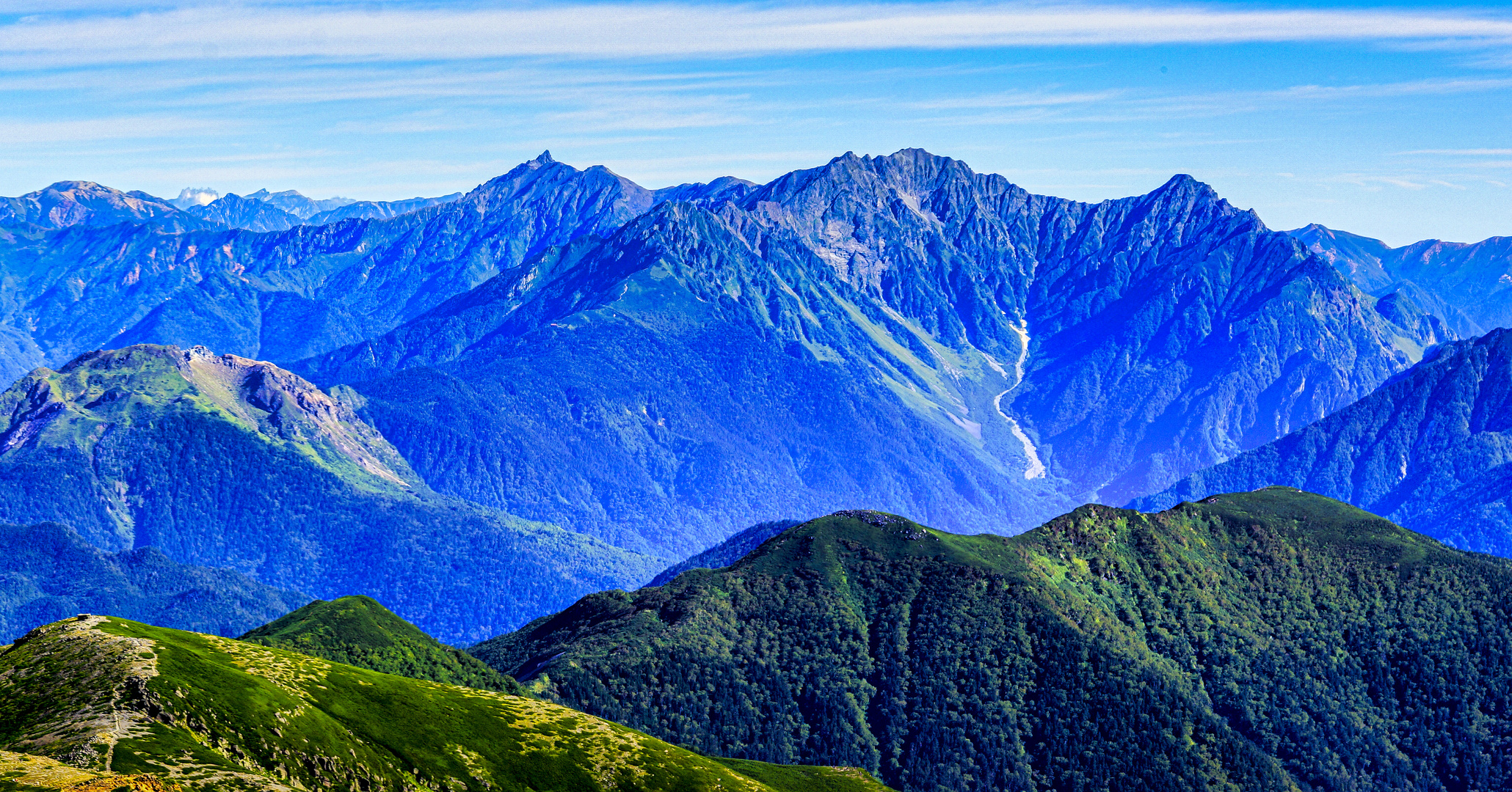 中央やや右が穂高連峰、氷河跡の下は上高地。 穂高連峰の左で凸っているのは槍ヶ岳。その左後方の白い峰は立山連峰。 写真右側奥は白馬連峰。 写真左側手前は焼岳。