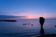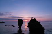 朝凪の海岸、空にゆっくり赤みが差してくるのを静かに見守りました。 ちょっと危なっかしいバランスの方が「えびす岩」、どっしりとそばに寄りそうのは「大黒岩」と呼ばれています。