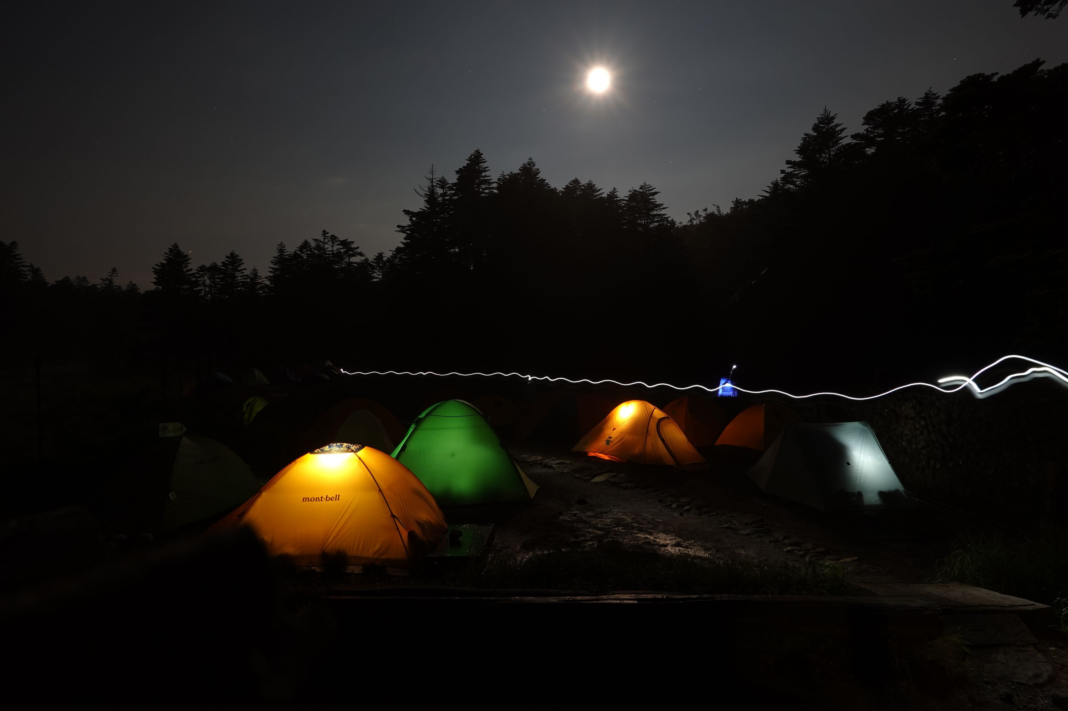 北八ヶ岳 黒百合ヒュッテのテント場 登山者のヘッドライトが軌跡となりました