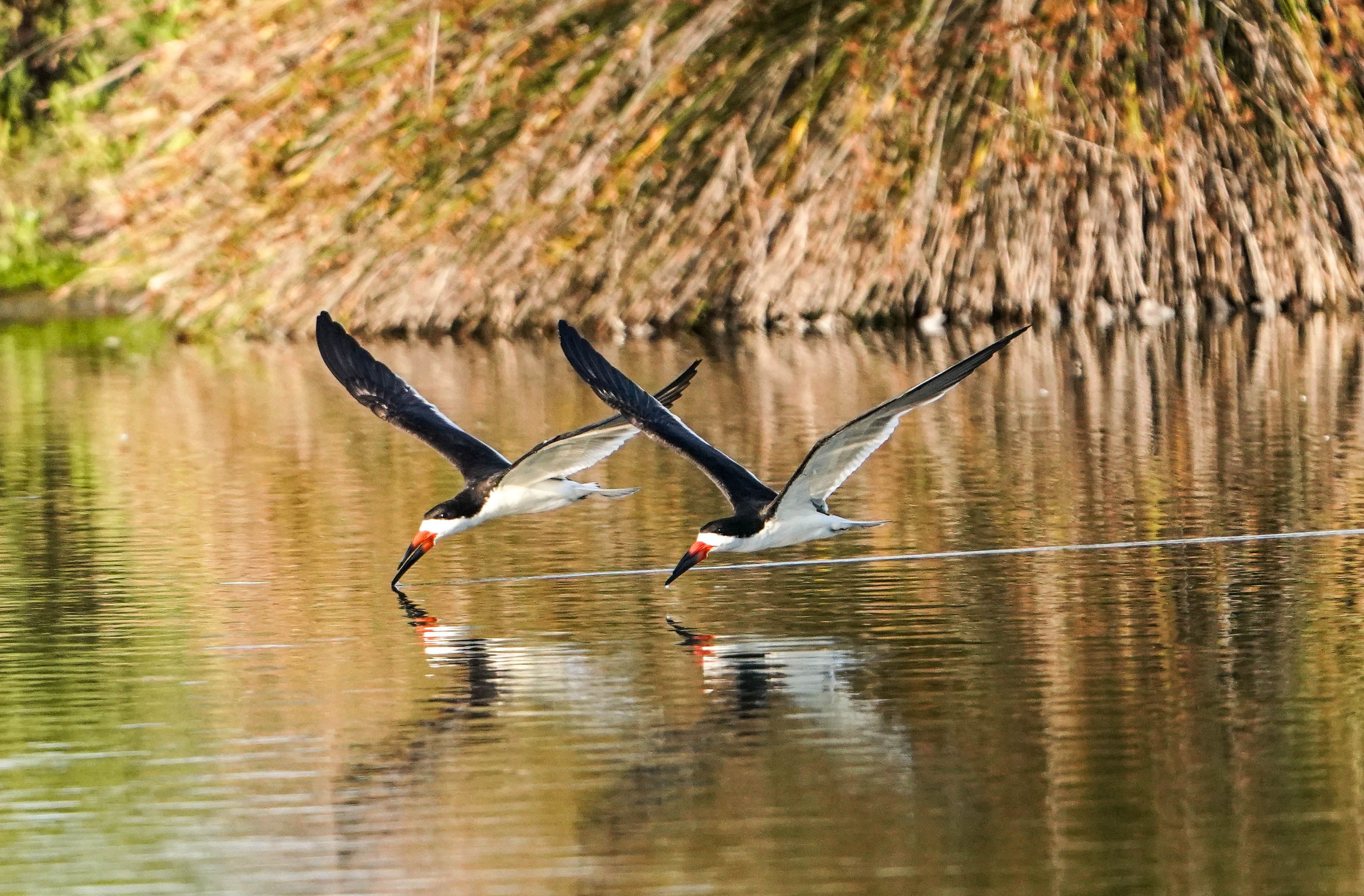 撮影地:San Joaquin Wildlife Sanctuary, Irvine, California 水面スレスレに飛翔するSkimmer(クロハサミアジサシ)