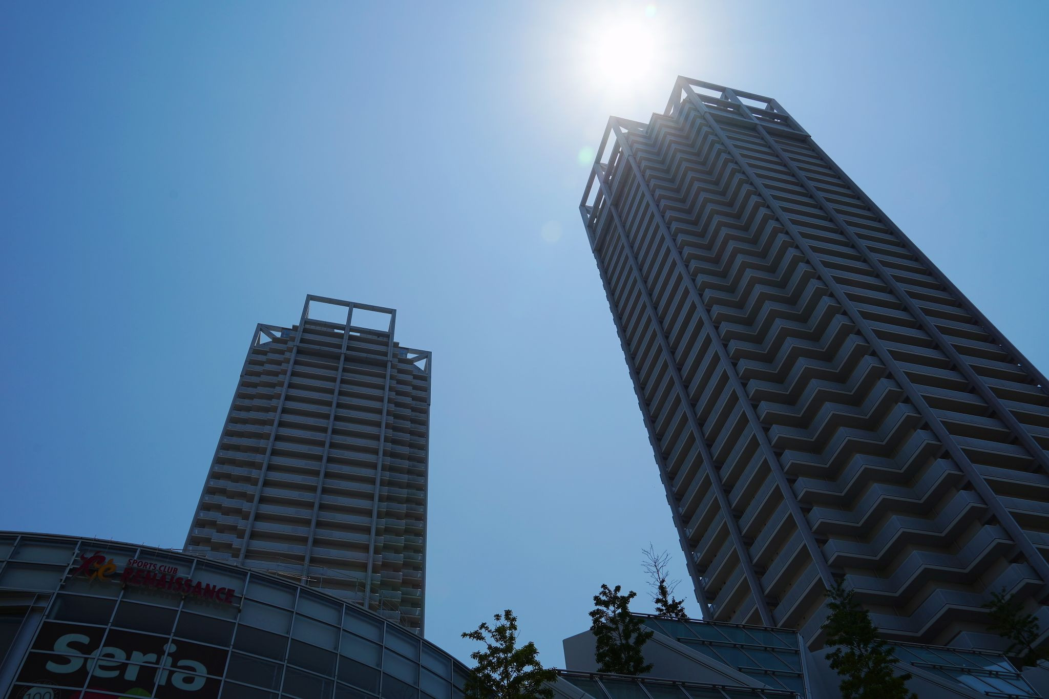 泉大津駅前のツインタワービルを下から撮影、暑い太陽が降りそそいでいました。