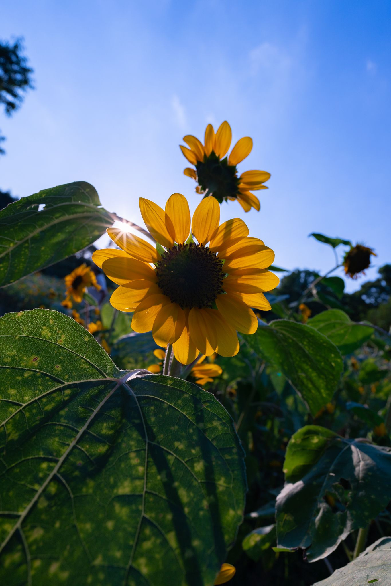 初投稿。 広角単焦点で寄って撮影。 ちょうど向日葵の背中に太陽があったので、絞って光芒が綺麗に出るように撮影しました。