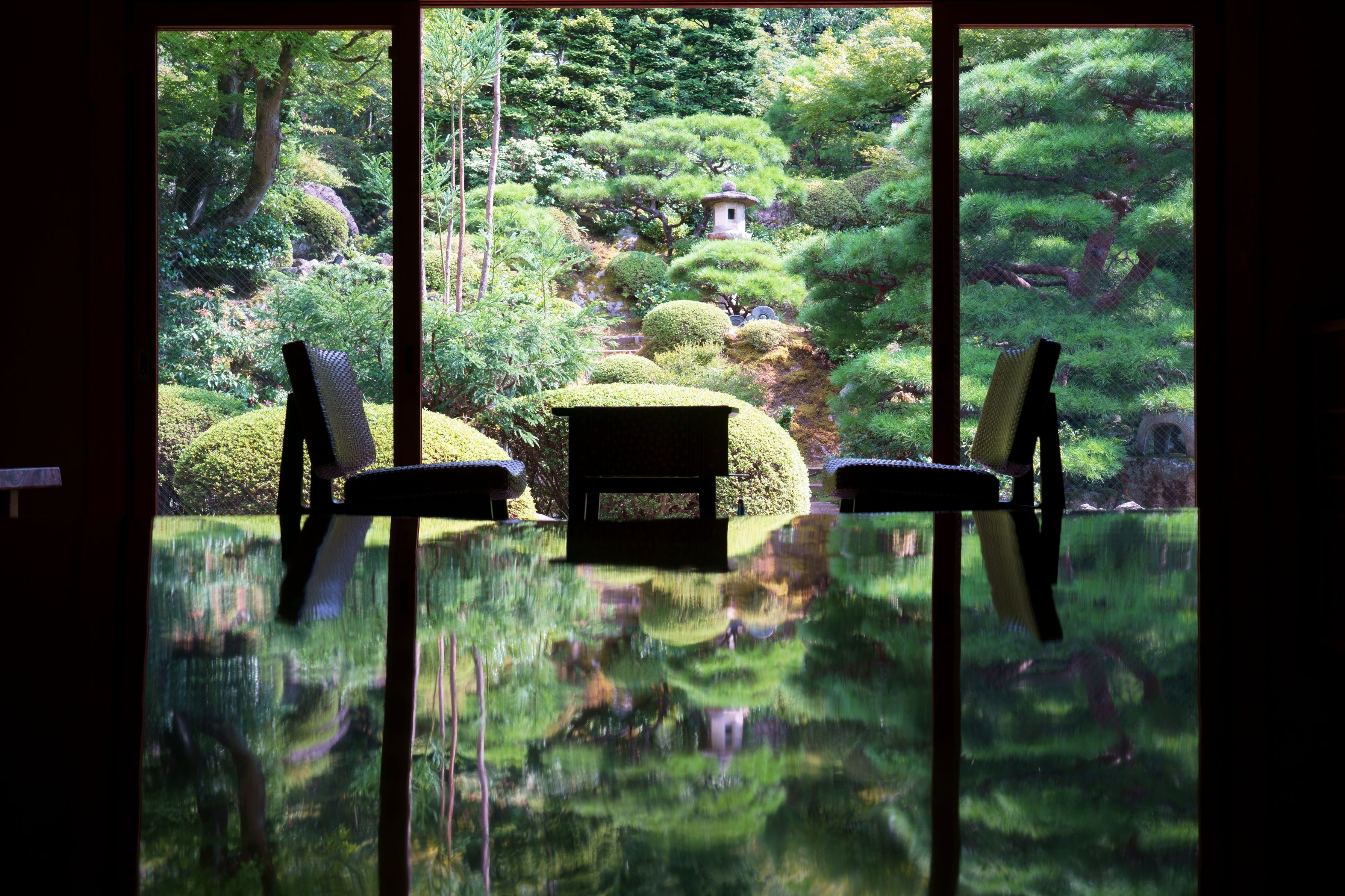 引き戸も窓もすべて開け放っての公開で三密を避けられるため思い切って行きましたが、うだる暑さに入り口で勧められるままについ飲物を注文。エアコンのある別部屋で一人涼みました。 2枚重なった網入りのガラス戸が一風変わった効果を生んでいたのを自分への言い訳にして、お決まりの映り込みを撮らされてきました(^^ゞ